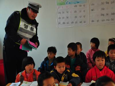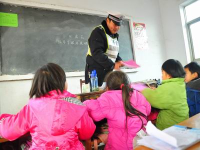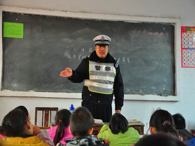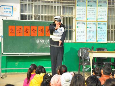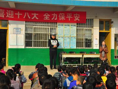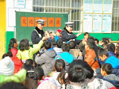 周寨小学的齐校长引荐我们来到办学规模相对更大的中心校—刘寨小学。校园里,全校师生整整齐齐集合在操场上,大概是因为校长是女性,心细的缘故,主席台上的黑板上,红底黑字端庄地写着“交通安全讲座”六个大字。曹强站在主席台上从随身佩戴的单警装备入题,一下子就把同学们的注意力吸引过来,曹强深入浅出的讲解高速公路上禁止穿越、禁止抛洒物品等实用性很强的安全知识和法律法规。在这堂课的尾声,曹强向学生们发放最新印制的宣传小卡片,同学们热情高涨地围住警察叔叔,高举着小手讨要卡片。此刻,孩子们显得很兴奋,很快乐!