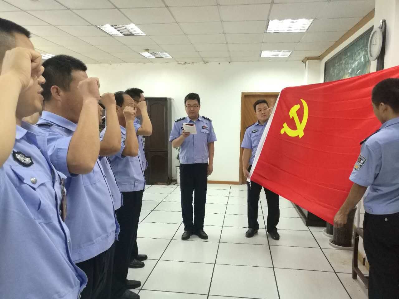 6月28日上午,三支队组织全体民警开展 “重温入党誓词”活动,党员面对党旗,重温入党誓词,表达不忘初心,继续为党的事业奋斗终身的决心。
