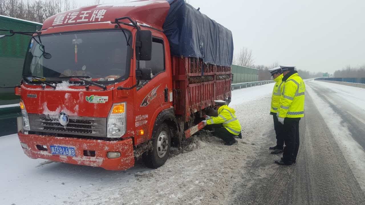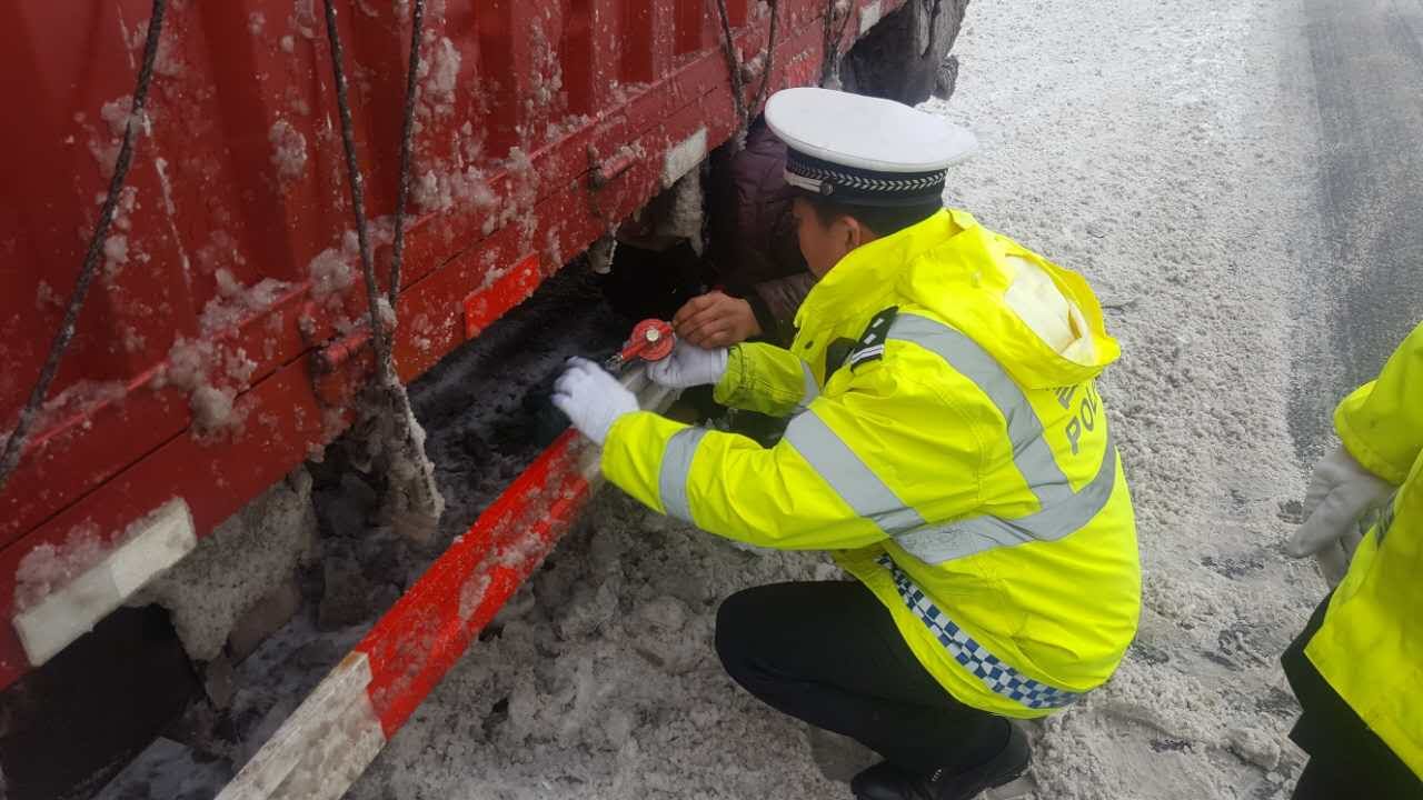 元月3日上午10时许,安阳高速交警二大队民警喻文勇带领杜松伟、徐明凯、张建彬、索新宇共4名辅警在辖区路段组织养护部门进行除雪工作,行进到K1871公里处时,发现一辆拉满橘子的红色货车在路上抛锚,喻文勇同志立即停车,让辅警在该车后方摆放警示标志,看见司机师傅趴在车底,冻的瑟瑟发抖,手和脸冻得通红,经询问得知,由于刹车管爆裂漏气,刹不住车,民警立即取出随车工具箱,帮助司机师傅简单的修理后,护送该车到服务区做进一步检修,司机李师傅非常感动,拿出一袋子橘子表示感谢,被民警婉言谢绝。