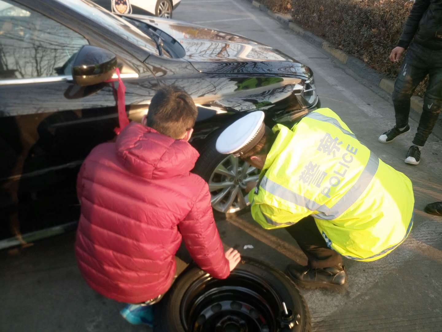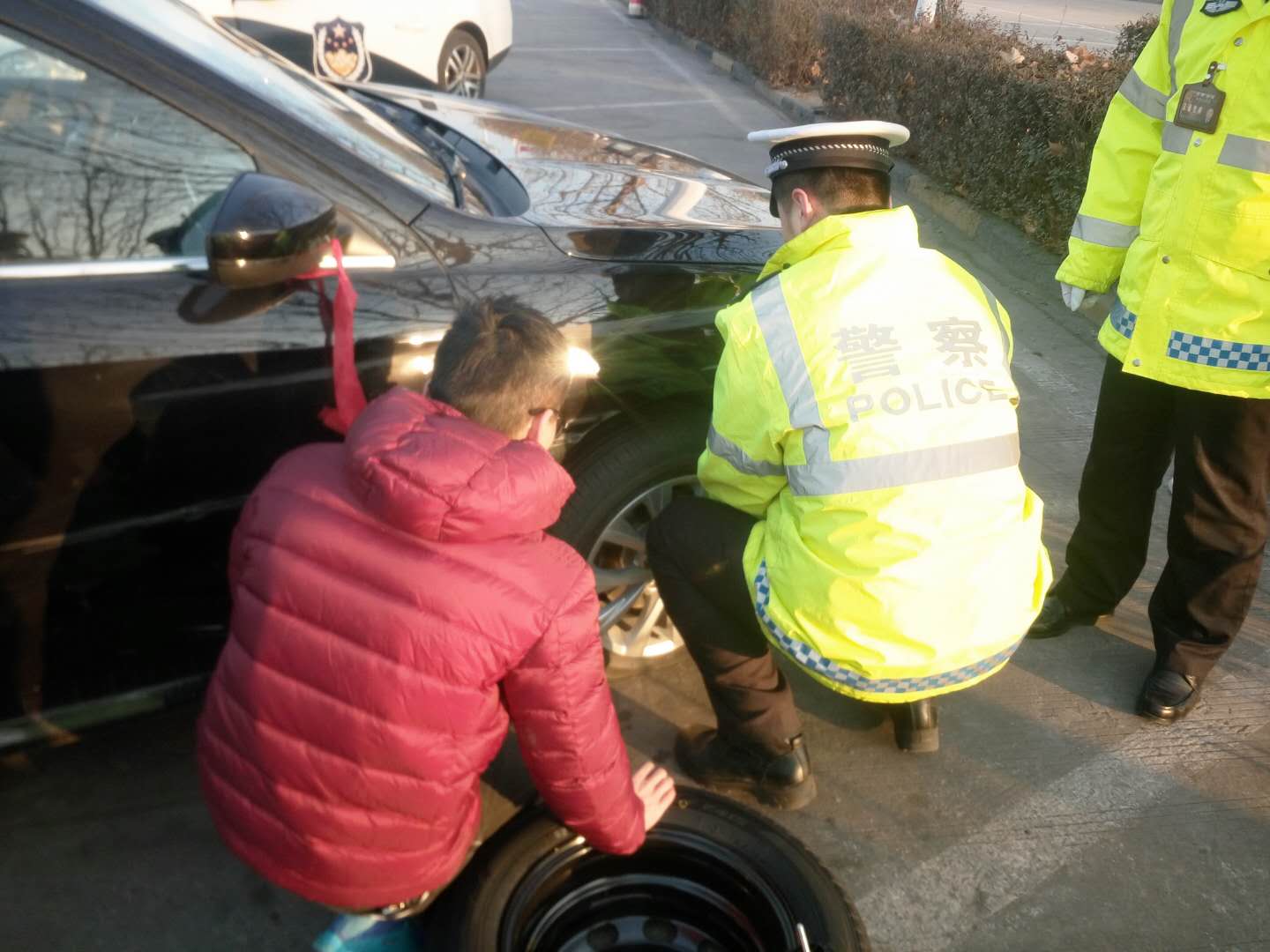 2018年1月11日下午,正在安阳西站开展“平安守护”专项行动的高速交警一大队民警接警称有一辆小型轿车在高速上发生事故,现在在曲沟服务区,接警后民警立即驱车赶往事故现场,到达现场后了解情况得知驾驶员是在高速公路上发生了单方事故,由于没有经验,便驱车离开了,直到车辆行驶到曲沟服务区,司机下车检查车辆才发现爆胎了,眼下是在远离城市的高速公路,前不挨村后不着店的,十分着急,一筹莫展之时,才想起来报警,希望警察能帮帮他,知晓情况后,民警哭笑不得,一边告知司机在高速上发生事故后应该采取的措施,一边开始从后背箱中取出备胎及修理工具帮助司机更换轮胎,没有十几分钟的功夫,轮胎换好了,虽然当下已是三九天,可民警头上已经开始冒汗,看着正在擦汗的民警,驾驶员心里十分感动,说到:今天要不是你们我真的不知道怎么办,真心的感谢!换好轮胎后,民警又反复的检查了轮胎,看是否安全。