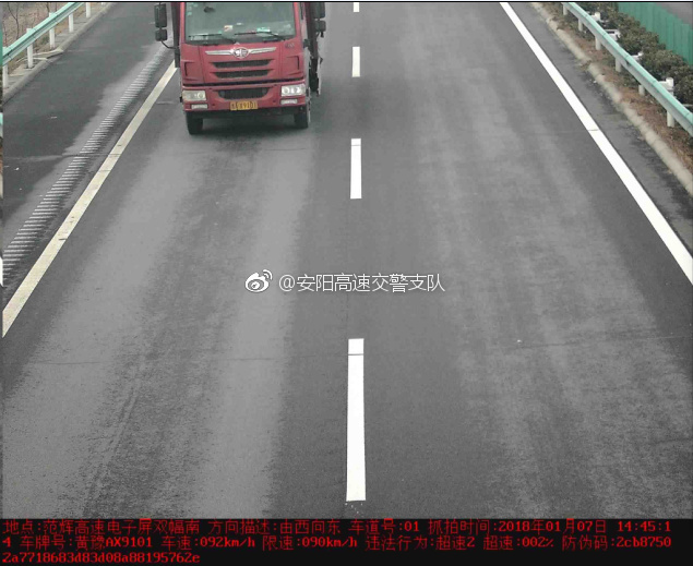 #文明交通·安全伴您行# 【违法曝光台】2018年1月7日14时45分,豫AX9101货车在范辉高速68公里+650米处违反载货汽车在高速公路超速未达20%的行为,扣6分,罚款200元。高速交警温馨提示:请依法、安全、文明行车,平安出行!