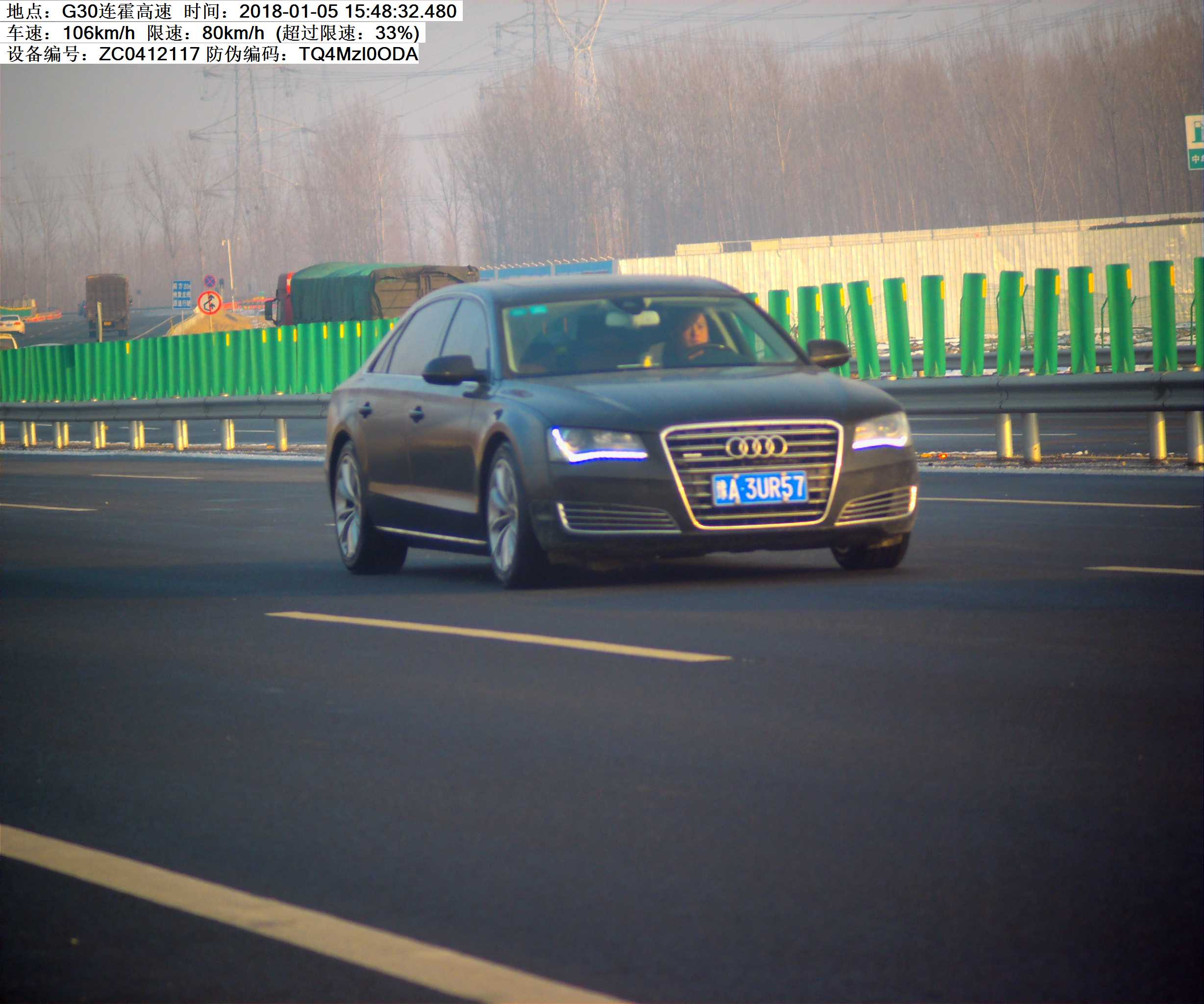 2018年1月5日15时48分,豫A3UR57小型汽车在连霍高速K548处超速33%罚款200元,记6分.高速交警温馨提示:请依法、安全、文明行车,平安出行!