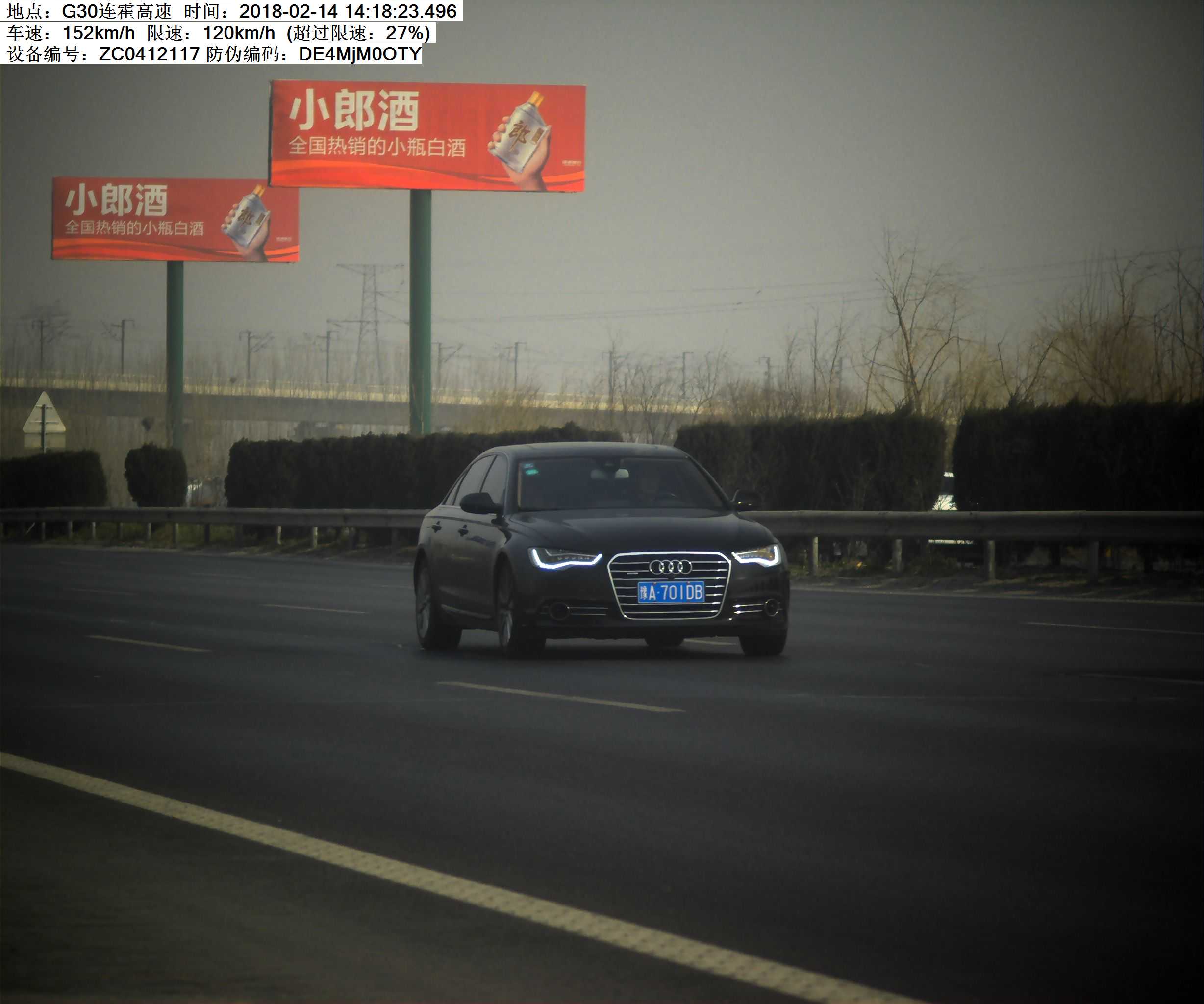 2018年2月14日14时18分,豫A701DB小型汽车在连霍高速K546处超速27%罚款200元,记6分.高速交警温馨提示:请依法、安全、文明行车,平安出行!