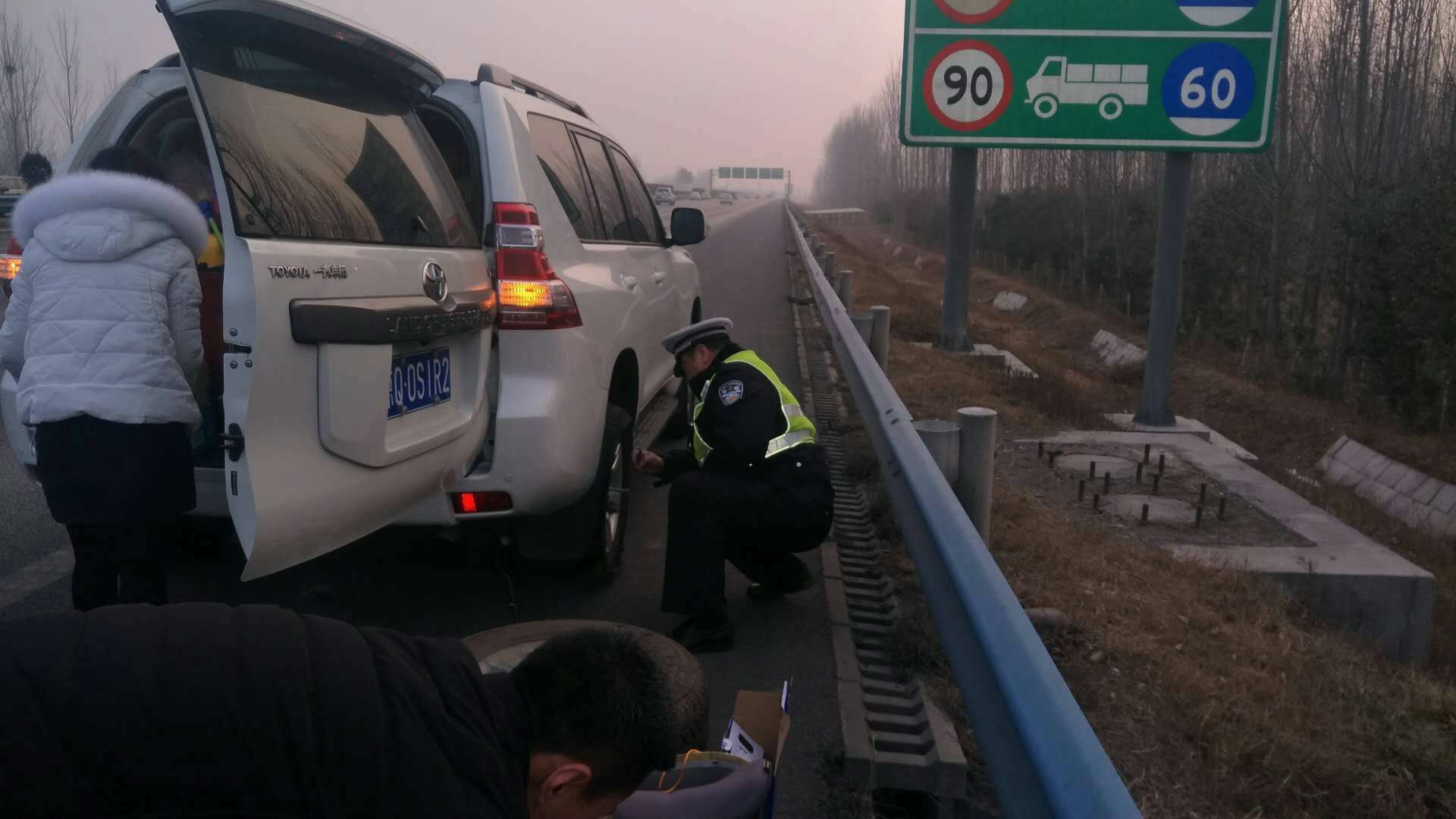 经了解得知,车主是河北人,春节后准备返程,行驶过程中突然发现车辆不停颠簸,停车检查后发现车辆后轮爆胎。李某从车辆后备箱中找出备用轮胎准备更换,没料到车内未携带更换轮胎工具无法更换,不得不将车辆“抛锚”在此,加之路上车辆多、速度快,一家人一时手无足措。