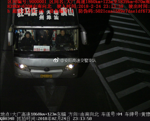 #文明交通·安全伴您行# 【违法曝光台】2018年2月25日23时13分,豫QB0348客车在大广高速1860公里123米至大广高速处违反驾驶中型以上载客汽车在高速公路上行驶超过规定时速未达20%的,扣6分,罚款200元。高速交警温馨提示:请依法、安全、文明行车,平安出行!