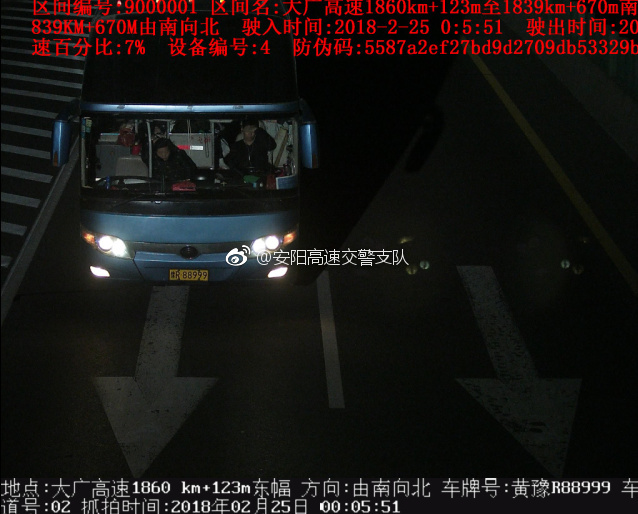 #文明交通·安全伴您行# 【违法曝光台】2018年2月25日0时05分,豫R88999客车在大广高速1860公里123米至大广高速处违反驾驶中型以上载客汽车在高速公路上行驶超过规定时速未达20%的,扣6分,罚款200元。高速交警温馨提示:请依法、安全、文明行车,平安出行!