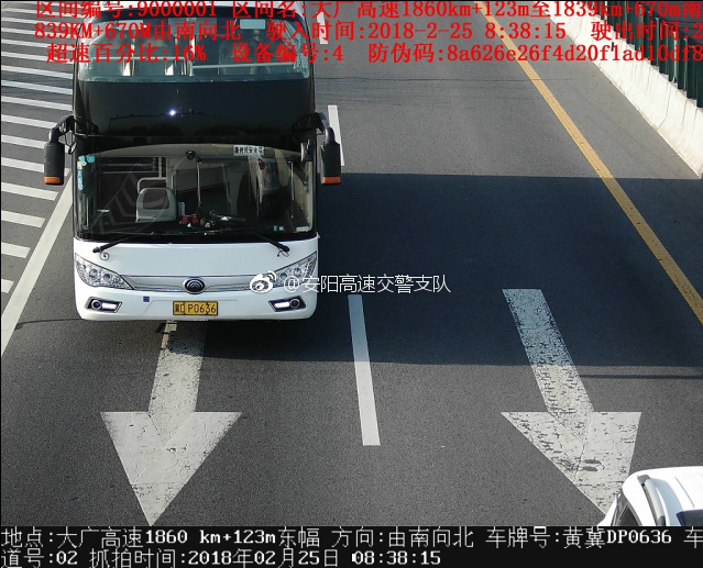 #文明交通·安全伴您行# 【违法曝光台】2018年2月25日08时38分,冀DP0636客车在大广高速1860公里123米至大广高速处违反驾驶中型以上载客汽车在高速公路上行驶超过规定时速未达20%的,扣6分,罚款200元。高速交警温馨提示:请依法、安全、文明行车,平安出行!