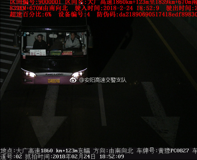 #文明交通·安全伴您行# 【违法曝光台】2018年2月24日19时04分,豫PC0827客车在大广高速1860公里123米至大广高速处违反驾驶中型以上载客汽车在高速公路上行驶超过规定时速未达20%的,扣6分,罚款200元。高速交警温馨提示:请依法、安全、文明行车,平安出行!