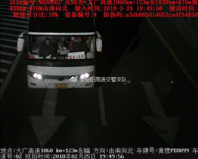#文明交通·安全伴您行# 【违法曝光台】2018年2月25日19时49分,豫PE8099客车在大广高速1860公里123米至大广高速处违反驾驶中型以上载客汽车在高速公路上行驶超过规定时速未达20%的,扣6分,罚款200元。高速交警温馨提示:请依法、安全、文明行车,平安出行!