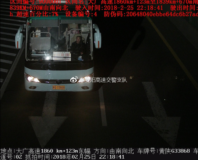 #文明交通·安全伴您行# 【违法曝光台】2018年2月25日22时18分,陕G33868客车在大广高速1860公里123米至大广高速处违反驾驶中型以上载客汽车在高速公路上行驶超过规定时速未达20%的,扣6分,罚款200元。高速交警温馨提示:请依法、安全、文明行车,平安出行!