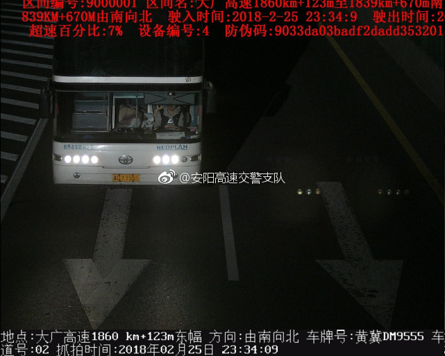 #文明交通·安全伴您行# 【违法曝光台】2018年2月25日23时34分,冀DM9555客车在大广高速1860公里123米至大广高速处违反驾驶中型以上载客汽车在高速公路上行驶超过规定时速未达20%的,扣6分,罚款200元。高速交警温馨提示:请依法、安全、文明行车,平安出行!