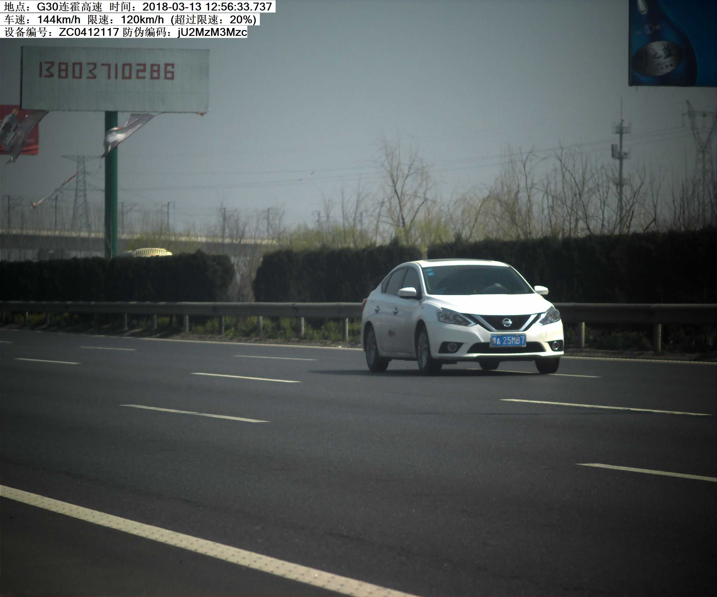 2018年3月13日12时56分,豫A25MB7小型汽车在连霍高速K546处超速20%罚款200元,记6分.高速交警温馨提示:请依法、安全、文明行车,平安出行!