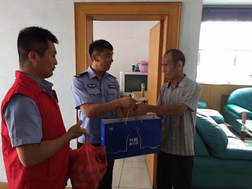 民警们首先来到社区贫困户张凯战家进行慰问。张凯战现年70岁,且常年有病,一家6口人住在一起,儿子夫妻两个失业下岗,孙女正在上学,生活困难。民警们送去了食用油,大米及日常用品,鼓励他们坚强勇敢地面对困难,并与社区的工作人员就如何搞好扶贫帮困工作进行了沟通与交流。