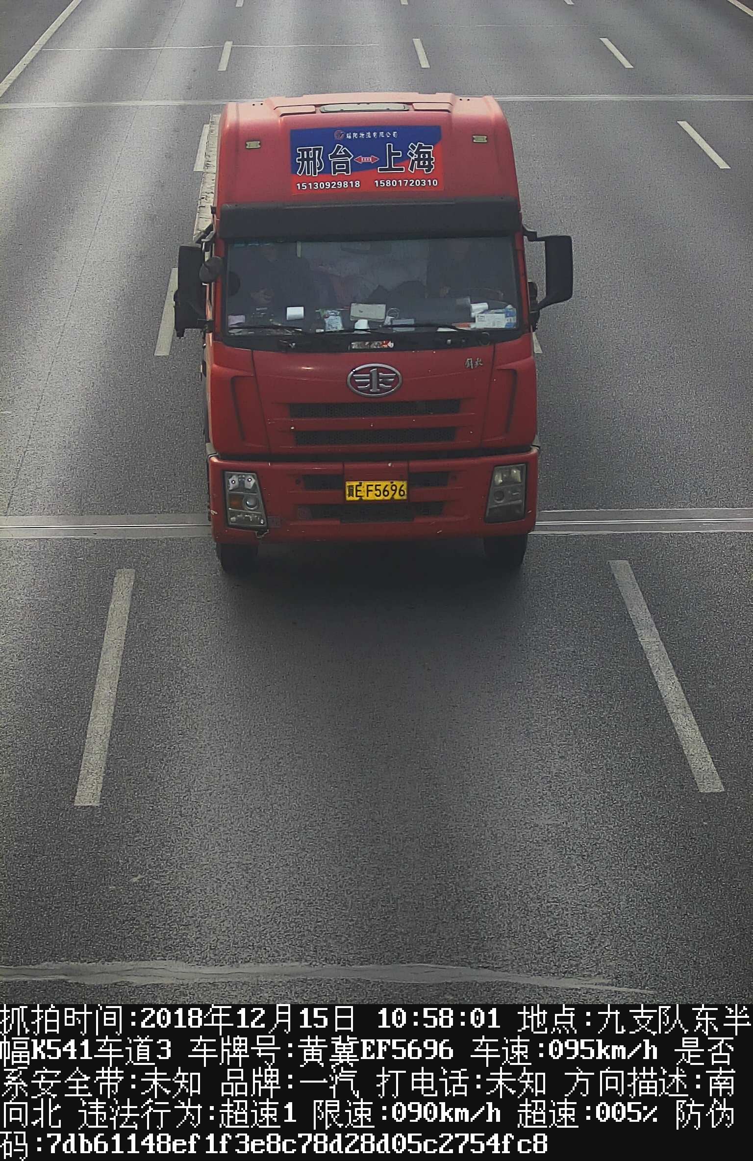 2018年12月15日10时58分,冀EF5696大型货车在G4京港澳高速541KM东半幅3车道,超速5%,罚200元记6分。