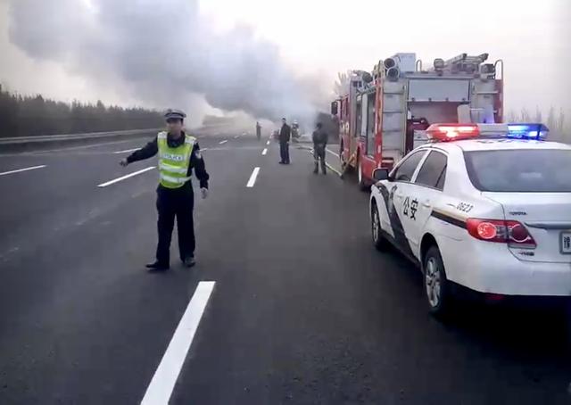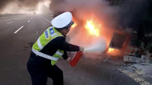 4月13日05时42分,河南省公安厅高速交警总队七支队指挥室接到报警称一辆半挂大货车在连霍高速公路665公里南半幅处起火,车辆占用部分行车道情况,十分危险。正在执行花会安保任务的民警七支队三大队大队长黄永洪立即带领辅警马鹏飞赶到现场。现场黑烟滚滚,加上噼里啪啦的爆燃声使过往车辆纷纷避让,民警一面设置警戒区,一面赶紧用警车上的灭火器进行灭火,附近村民看到火情也赶紧送来几个灭火器帮助灭火,但火势已起,仅靠灭火器难以扑灭,随后接到报警的消防队赶到现场,大火被及时扑灭,没有造成人员伤亡。