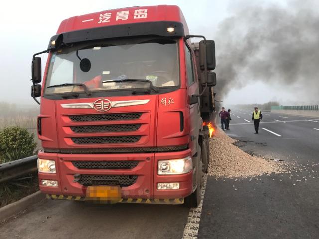 原来,焦作的岳师傅驾车前往郑州送石料,在行驶途中通过后视镜看到后轮胎有火苗,就赶紧下车查看,这时轮胎已经着火了。还好岳师傅及时报警,高速交警和消防队又及时赶到,避免了更大的损失。