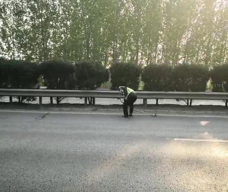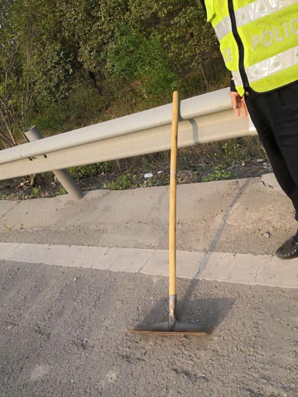 4月15日下午17时左右,平顶山高速交警大队民警李宇红、刘远光等人巡逻至宁洛高速南京方向661处时,发现道路中央隔离带旁横亘一把铁锹似障碍物,民警怀疑可能是道路养护人员遗落的劳作工具,如不及时清理将会给高速通行的车辆带来了极大的安全隐患。为防止交通事故的发生,执勤民警立即靠边停车、打开车载警示灯、提醒过往车辆减速慢行注意安全,并迅速对横亘在快车道旁的铁锹进行转移,及时消除了安全隐患。