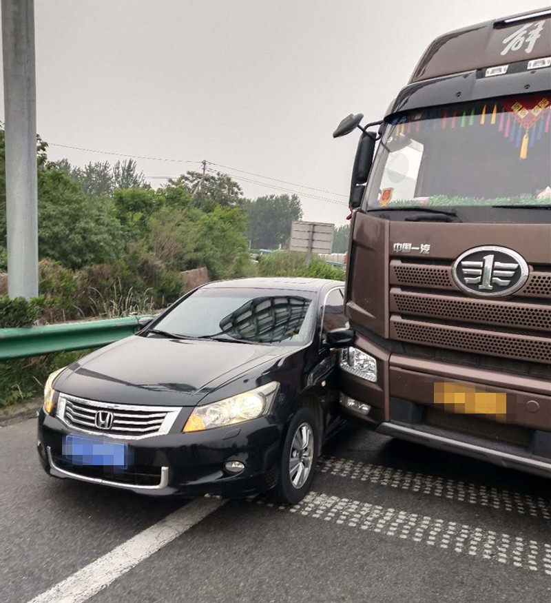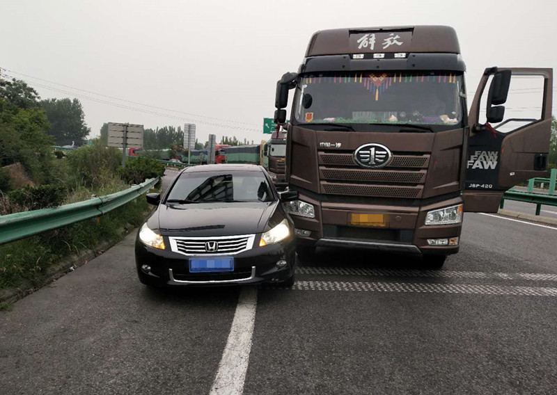 5月18日,一辆货车和一黑色小型轿车发生剐蹭,造成濮阳南下道口堵塞,濮阳高速交警紧急施救,确保路面正常通行。