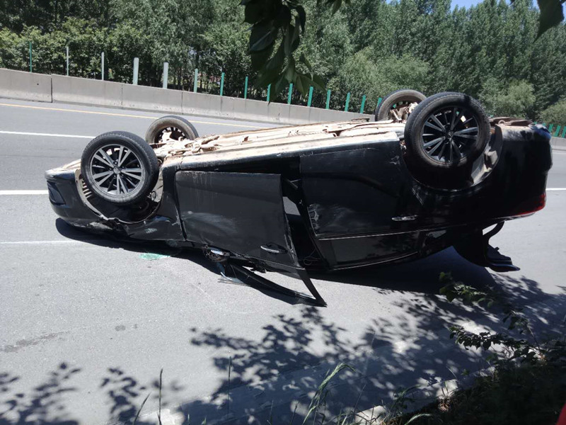 高速路上超车操作不当,小轿车“四脚朝天”