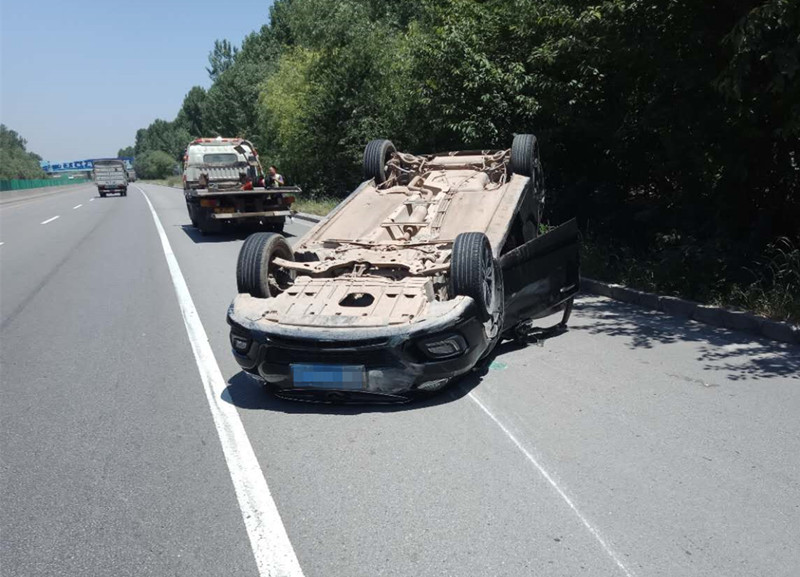 5月22日,一辆冀D牌照的黑色轿车行驶至大广高速K1792+300东半幅路段时,驾驶员在超车的过程中,由于一时操作不当,车子失控后直接倒翻路面。
