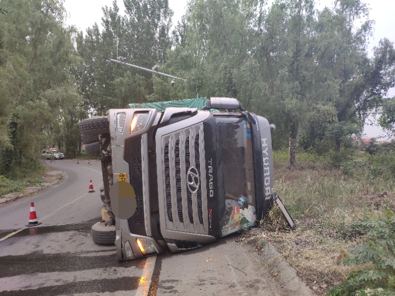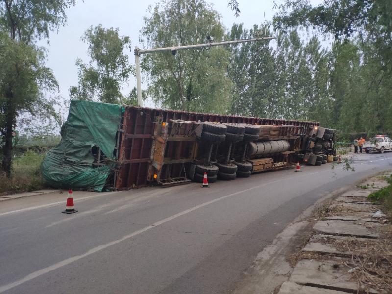 据了解,该事故是由于驾驶员在拐弯时没有控制好车速,加之车上货物装载过高,导致重心偏移造成侧翻。