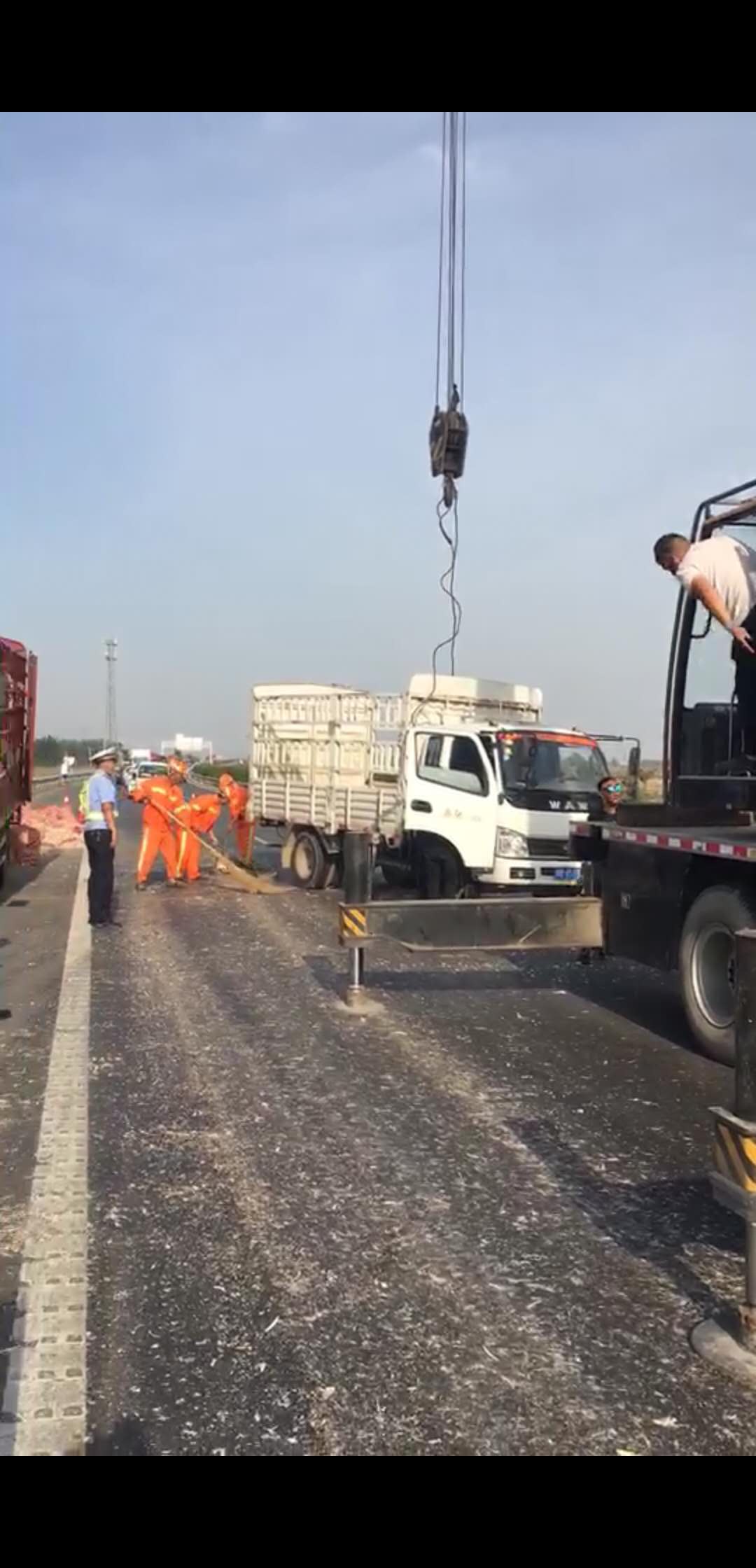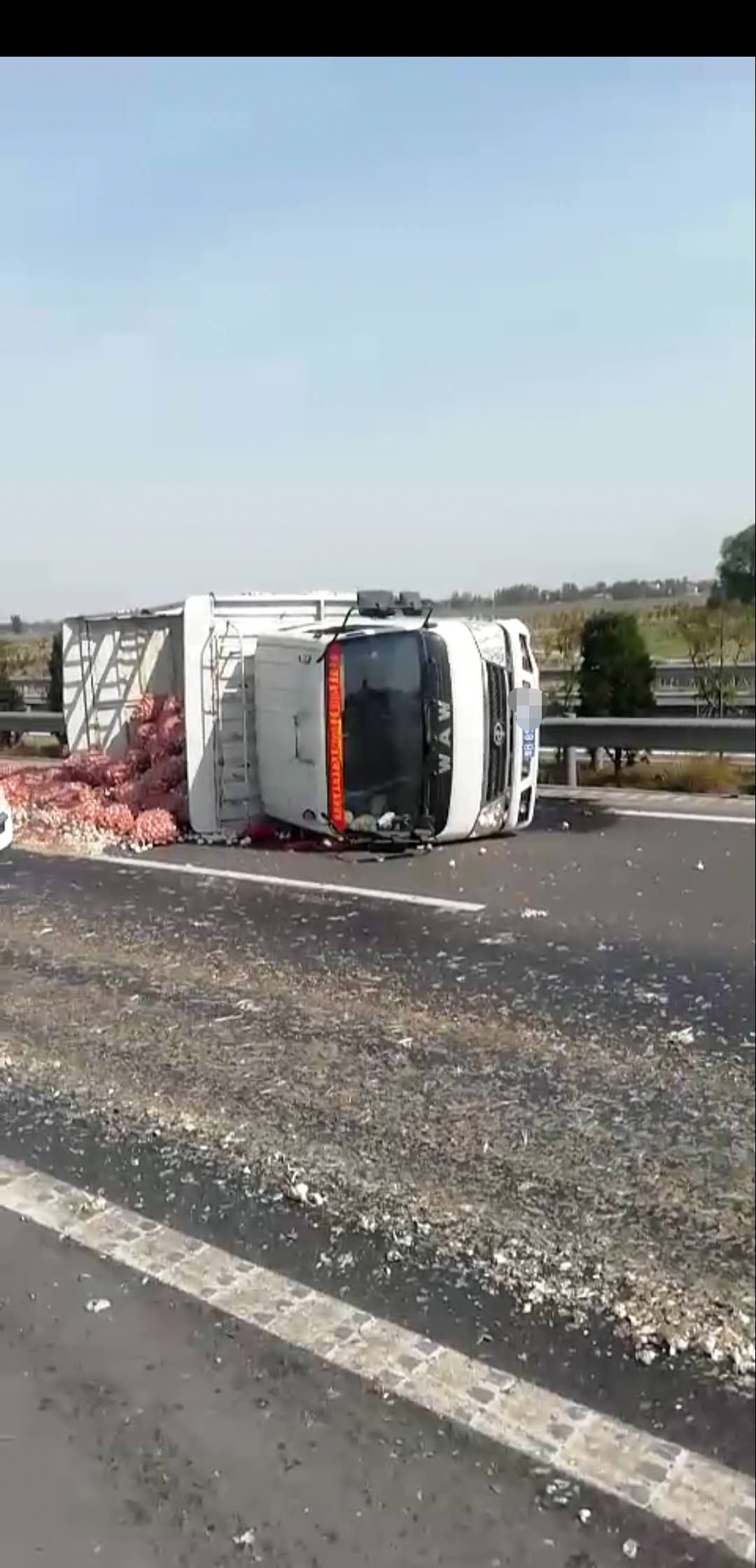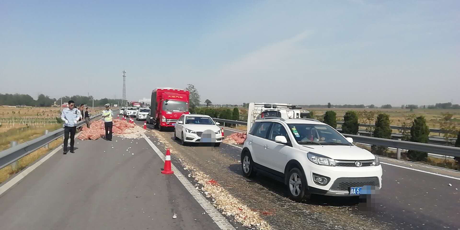 2019年6月9日,开封高速支队接到报警,郑民高速87公里处一辆拉蒜的货车侧翻在路边,整车大蒜倾覆路面,请求尽快出警。