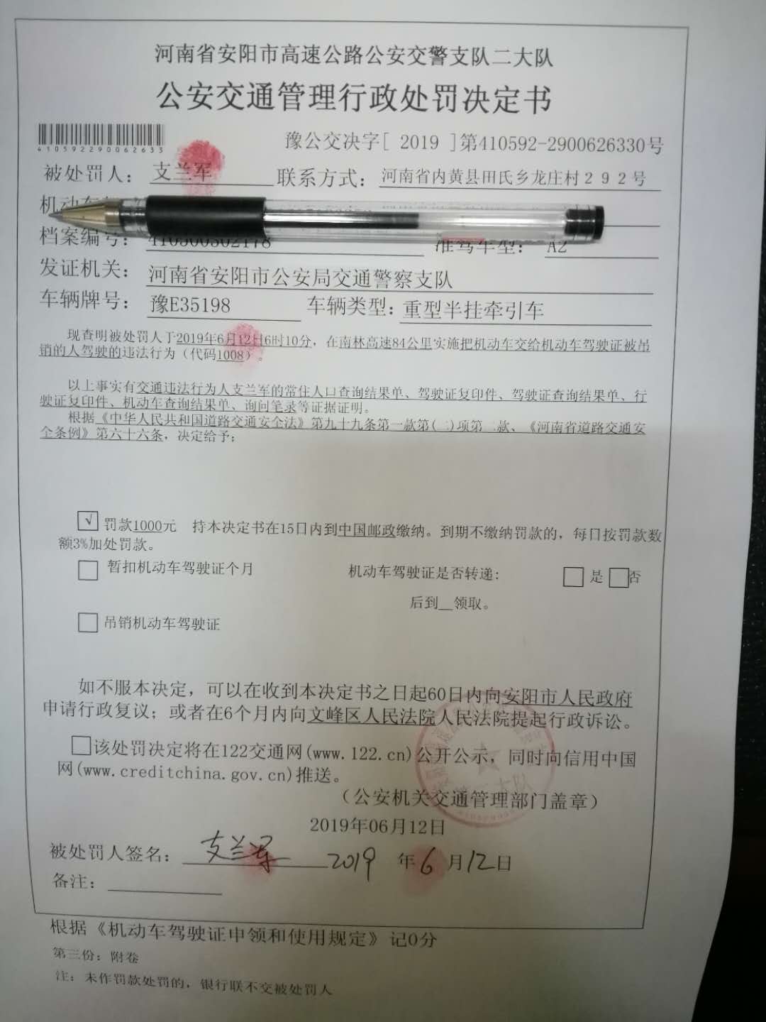 上午6时10分许,二大队民警在南林高速安阳东站对一辆车牌号为豫E35***重型半挂牵引车、豫E7***挂重型仓栅式半挂车进行检查时,发现该车司机支某军将车交给同车人支某山驾驶。经公安网查询支某山驾驶证信息时发现,支某山机动车驾驶证为吊销状态。支某山说,二人是父子,自己2014年因交通肇事被吊销驾驶证,也是担心父亲长期开车辛苦才会替父亲开车,不料刚开了没多久就被民警查获。