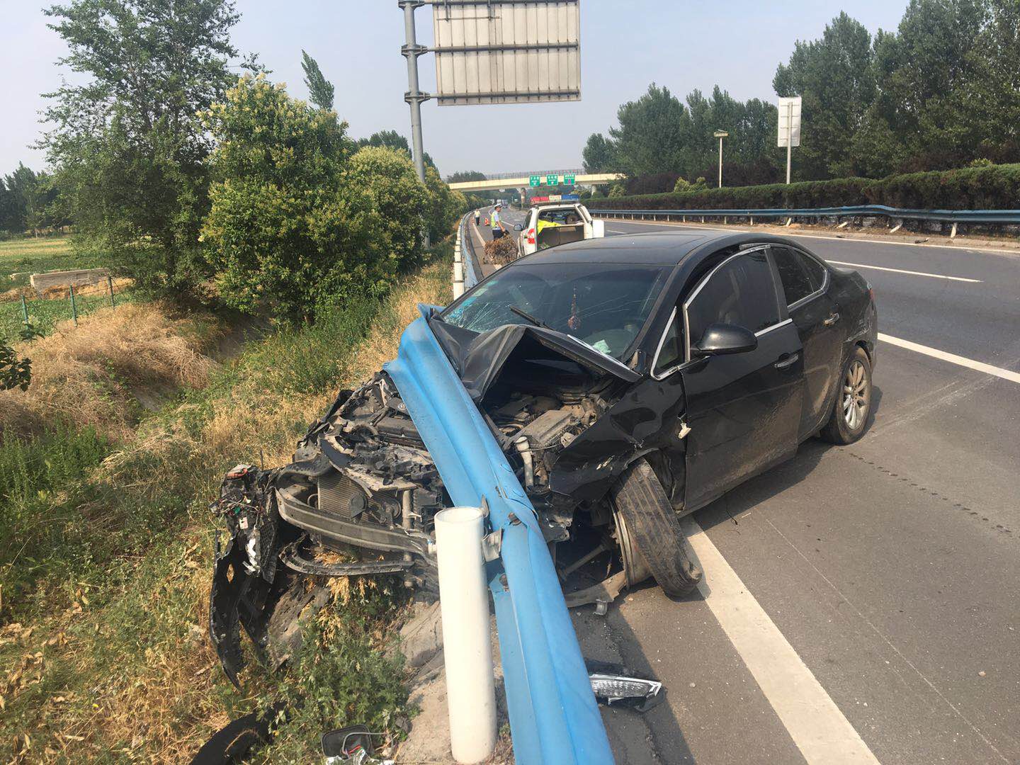 开封高速支队民警接报警后立即赶到现场,发现一辆黑色轿车车头扎进了应急车道旁的护栏上,车头严重变形,一旁的女司机神情恍惚一直在哭。