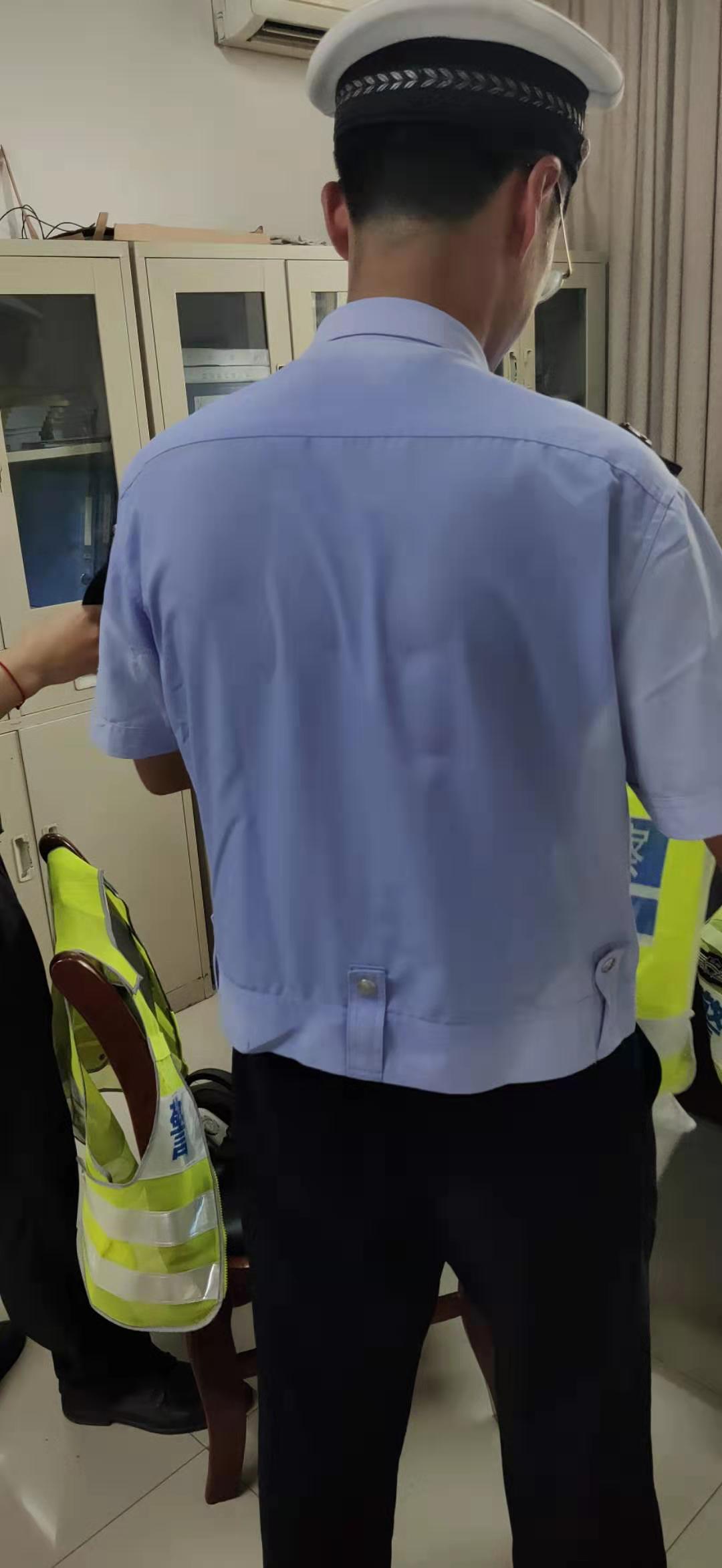 烈日下,蓝白相间的色彩映衬着他们黝黑的皮肤,蓝色的警服被汗水侵透,头发像洗过一样,挥汗如雨。在这炎热的夏天,成为路面上的一道美丽风景。