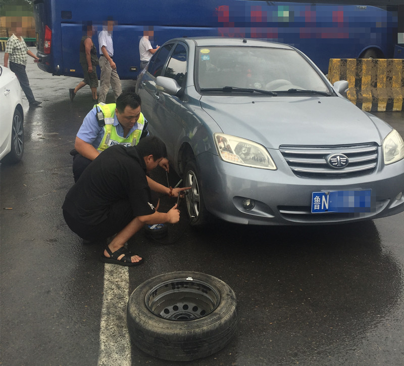 雨天车辆爆胎显尴尬 高速交警换胎暖人心