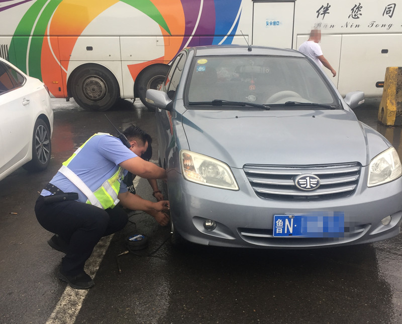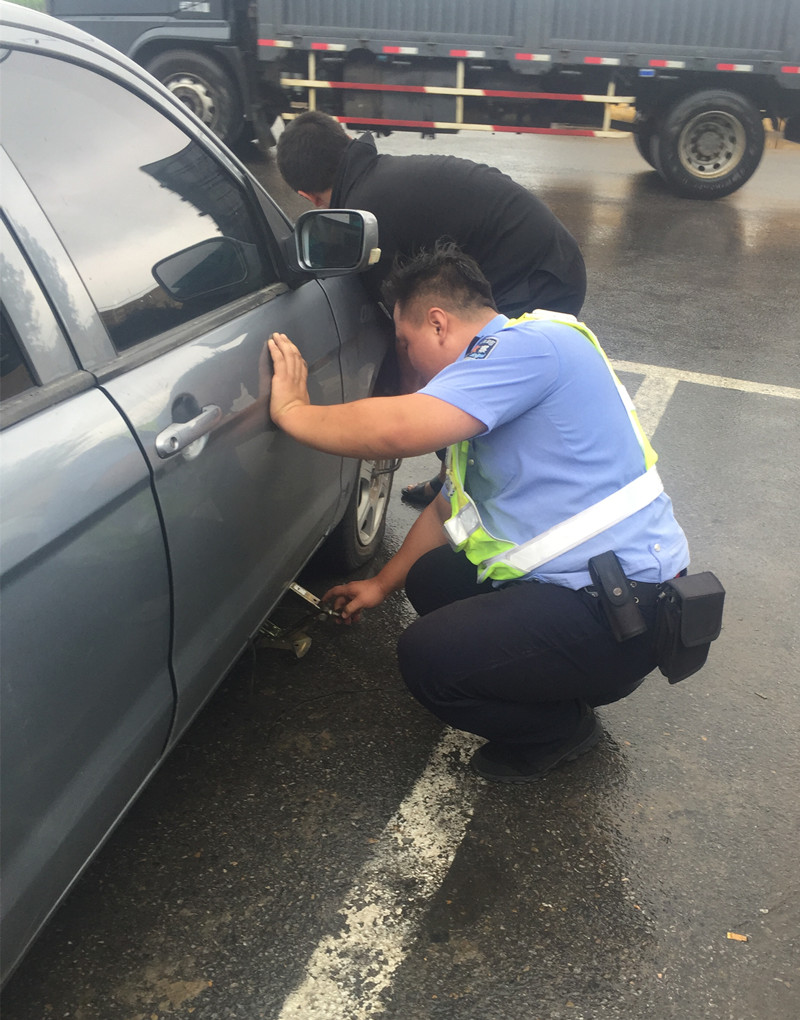 2019年8月10日中午时分,濮阳辖区大广高速全线大到暴雨,濮阳高速交警支队二大队执勤民警在豫冀省界执勤期间,发现一辆灰色夏利牌小轿车打着双闪灯停在车道上,车辆头部站着一名男子招手示意求救,执勤民警立即上前询问情况。经问询得知是车轮爆胎无法前行,司机万分焦急、不知所措。
