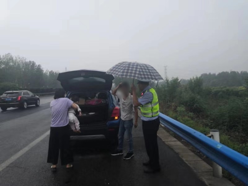 小轿车雨中突遇爆胎,司机犯愁时遇到高速交警来帮忙,愁解了心也暖了。这是昨日下午发生在宁洛高速雨中的一幕。
