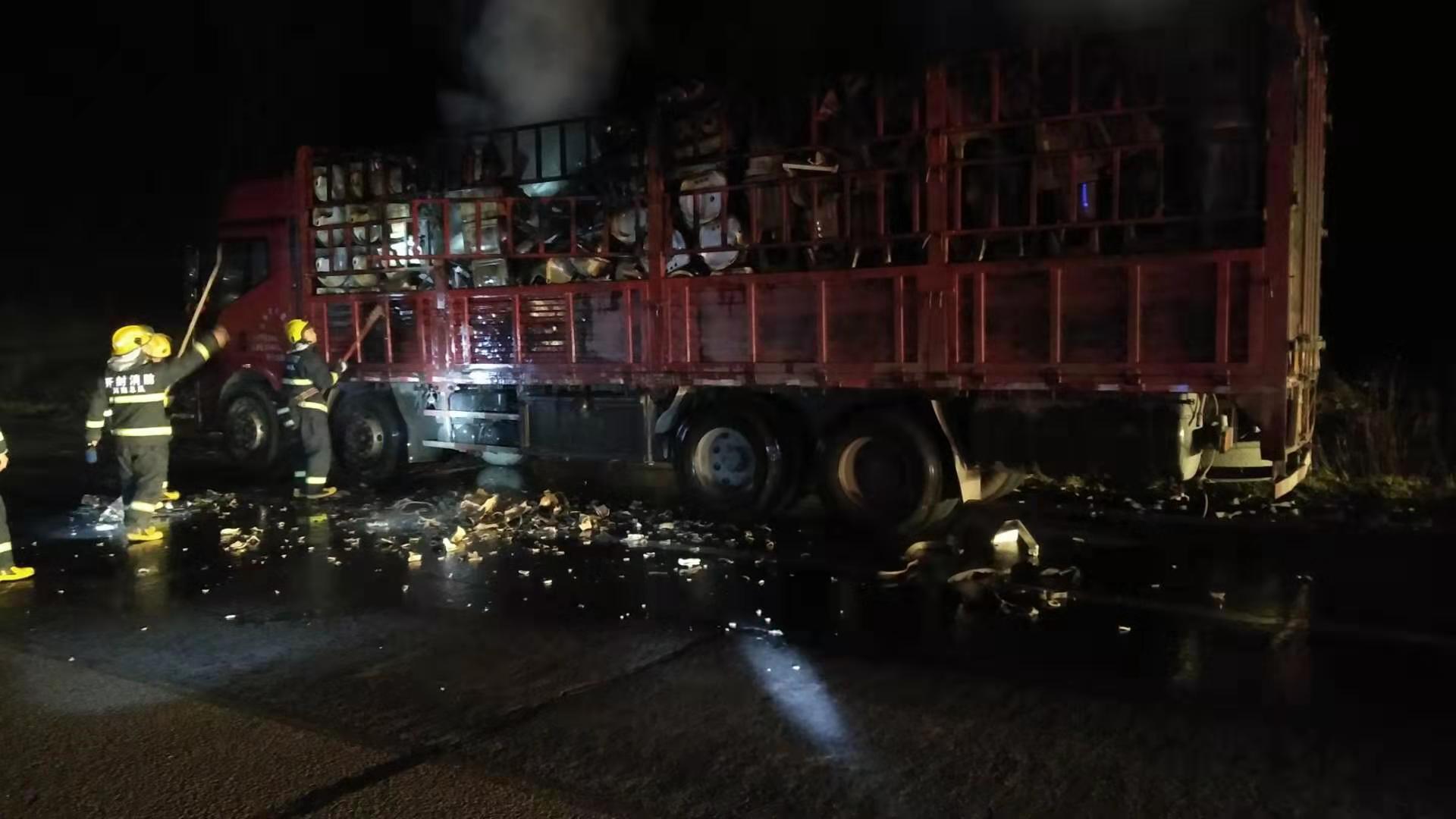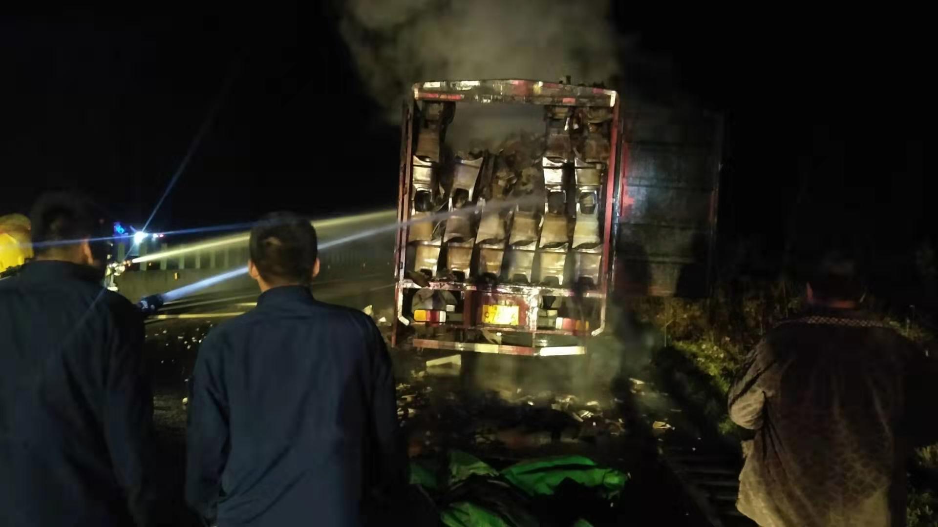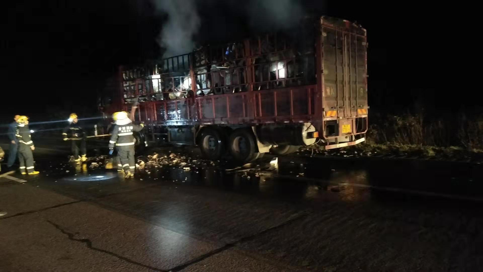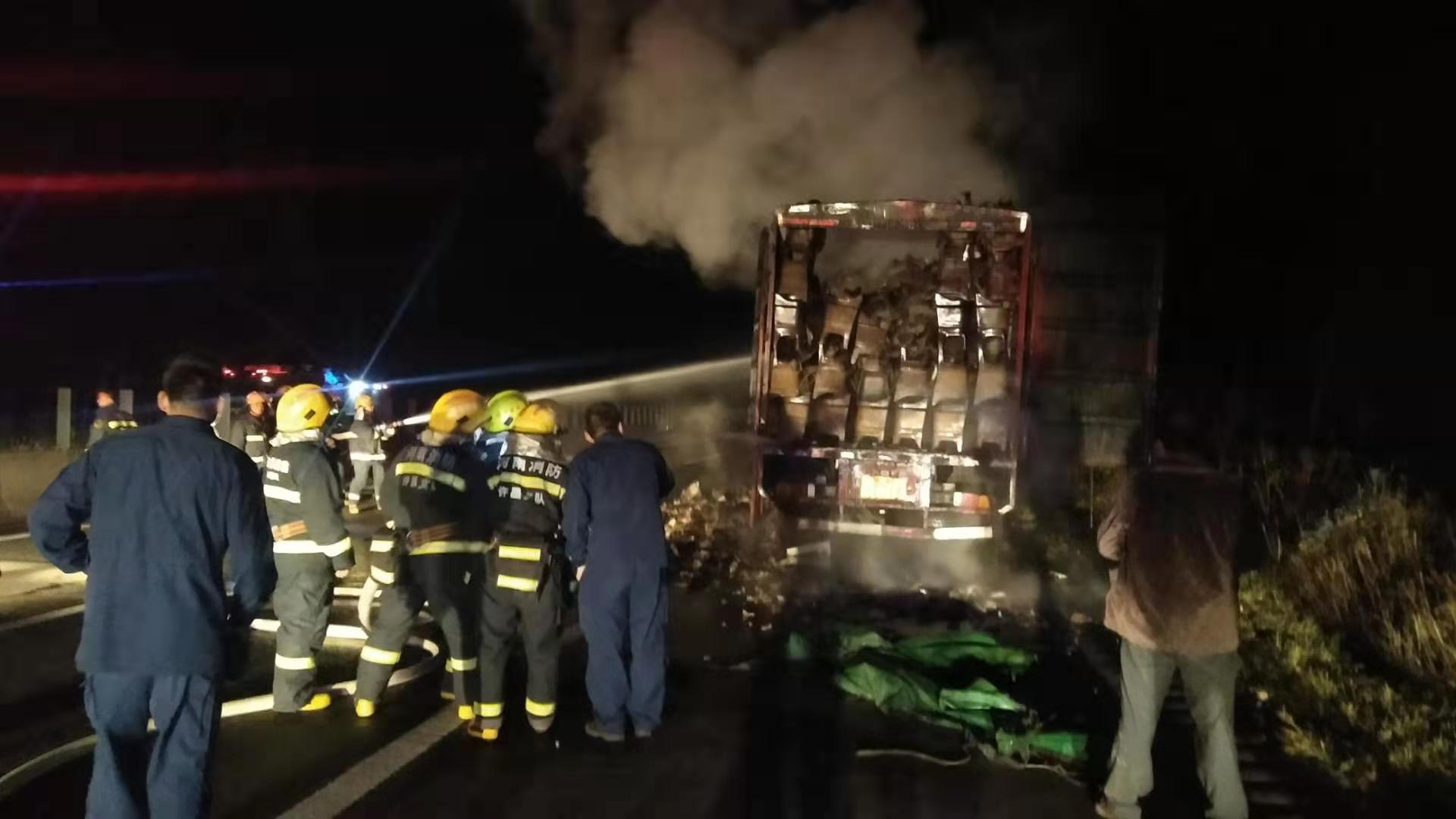 2019年11月19日晚21时左右,一辆货车行驶至兰南高速80公里处突然燃起熊熊大火,开封高速交警接到司机慌乱报警后,紧急前往着火现场途,并立即联系消防、施救部门尽快到达现场进行处置。