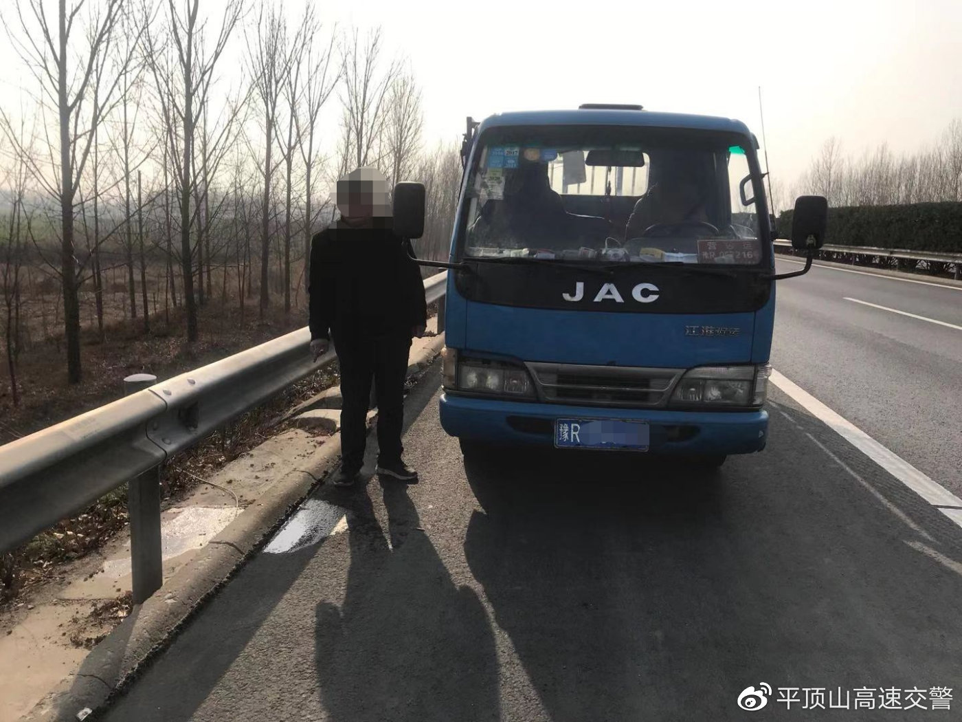 2020年1月13日下午13时35分许,平顶山高速交警大队民警杨波、刘兵兵等人,巡逻至兰南高速193公里处时,发现一辆豫R牌照的蓝色小型货车停在应急车道内,该车既未开启双闪警示灯,也未设置任何明显警示标志,一男子站在车头内侧正在小便,十分危险。民警随即做好安全防护上前询问,男子称自己是该车驾驶人程某,一时内急又嫌麻烦不想拐服务区才就边停车。