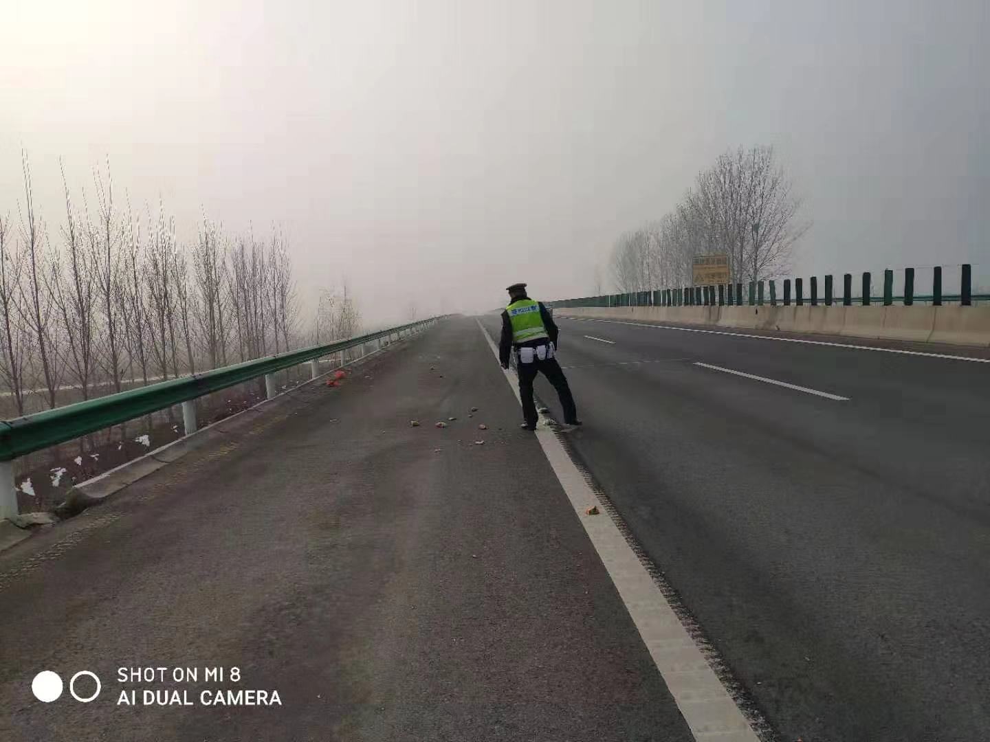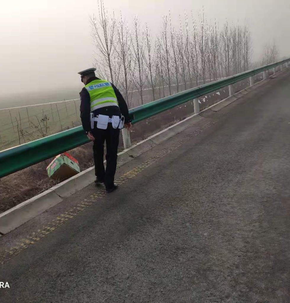 1月14日上午11时25分,一大队民警武志刚带领辅警王思宇、常杰巡逻至大广高速在K1849处时,远远发现有一纸箱子在行车道内,行车道内还散落着一些东西,给后方行驶的车辆造成了极大的安全隐患,情况十分危机。巡逻民警立即靠边停车,在现场采取鸣警笛方式提醒来车减速慢行,防止交通事故发生;另一边民警迅速将障碍物清理出高速公路外,从而排除了路面交通安全隐患,保障了路面车辆的交通安全环境。