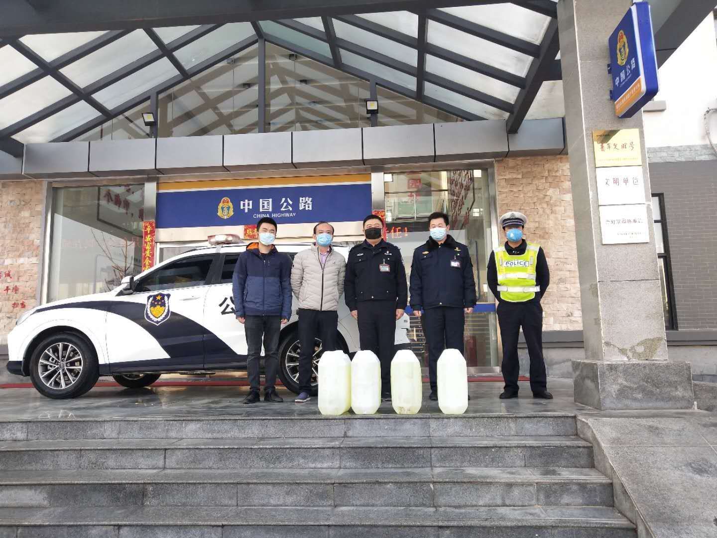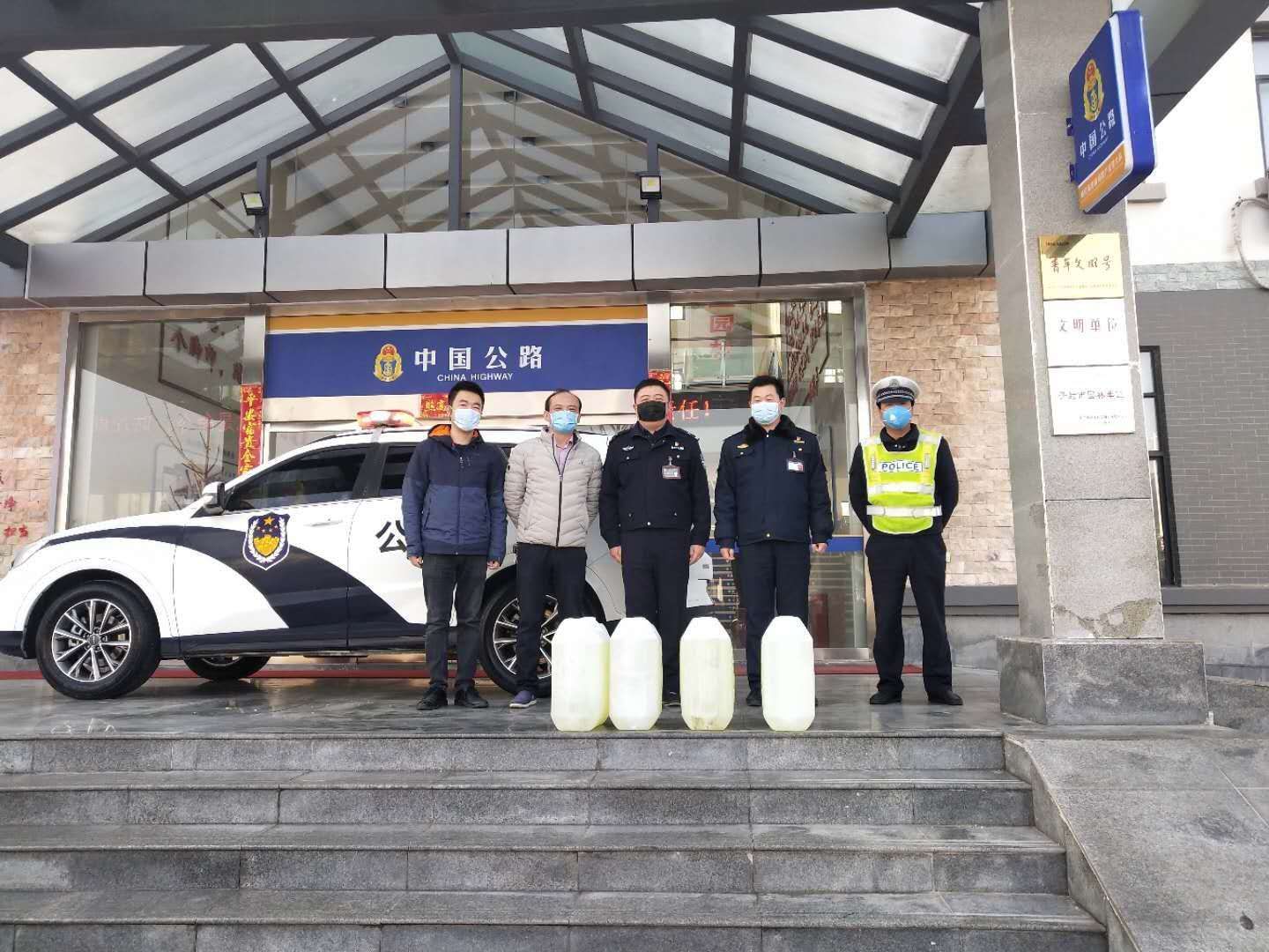 2020年2月9日上午9时,面对新型冠状病毒疫情防控的紧张形势,正在开封市高速支队南苑收费站站口执勤民警田羽宸接到朋友电话,称要来站口看望。当朋友来到疫情防控值班点,田羽宸才知原来是朋友自己出资,要为加班加点奋战在一线的疫情防控工作人员,送来84消毒原液。