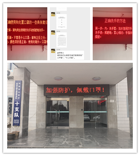 一是增强民警防感意识。通过支队内部微信工作群推送各类疫情防控知识;在办公区域电子显示屏滚动播放个人防护常识,增强防护意识。
