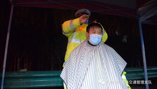 22点05分,“现在疫情期间,我看理发店开门不多,要不你牺牲一下短暂的休息时间,给我理理发?”,“中!没问题,你别嫌弃我剪得不好就中”教导员王超杰和辅警代利杰在许昌西站执勤卡点临时简易帐篷下说。消毒、系围巾、梳理、剪短、打薄.....一位“首席发型师”手拿理发器正精心地修理着队友的头发,几分钟后队友蓬乱的头发就被打理得整整齐齐,人也精神了许多。代利杰说:“现在正是抗击疫情的关键时刻,能为大家解决点小事,让战友们能心无旁骛的继续工作,才能早日实现抗击疫情的胜利!”