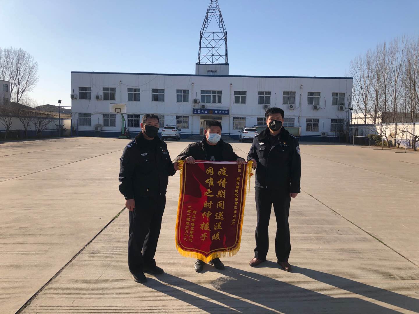 2020年2月17日下午15时50分,在开封高速支队通许队部院内,一面印有“疫情期间送温暖 困难之时伸援手”的红色锦旗在随风飘扬,被救助群众握着民警的手激动的说:“要不是你们及时救助,我不一定要承受多大的损失呢!”
