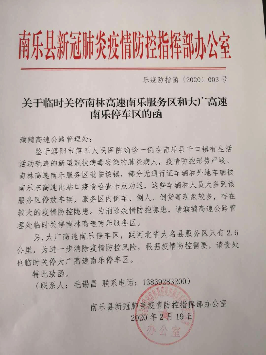 为进一步消除疫情防控风险,全力配合南乐县新冠肺炎疫情防控指挥部办公室相关防控部署,临时关停濮阳所辖南林高速南乐服务区和大广高速南乐停车区,届时车辆无法正常停靠,请提前规划好行车路线。