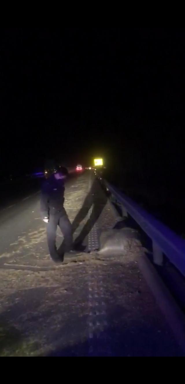 民警赶至现场,发现一货车遗留在路上的一袋疑似麸子的货物,过往车辆不得不绕道而行,加上夜间行车本就影响司机的视线,造成不便的同时,给过往的车辆留下极大的安全隐患,影响高速行车安全。见此情形,民警立即下车,将货袋抬至护栏边,清理干净路障,消除安全隐患,恢复了高速公路的安全和畅通。