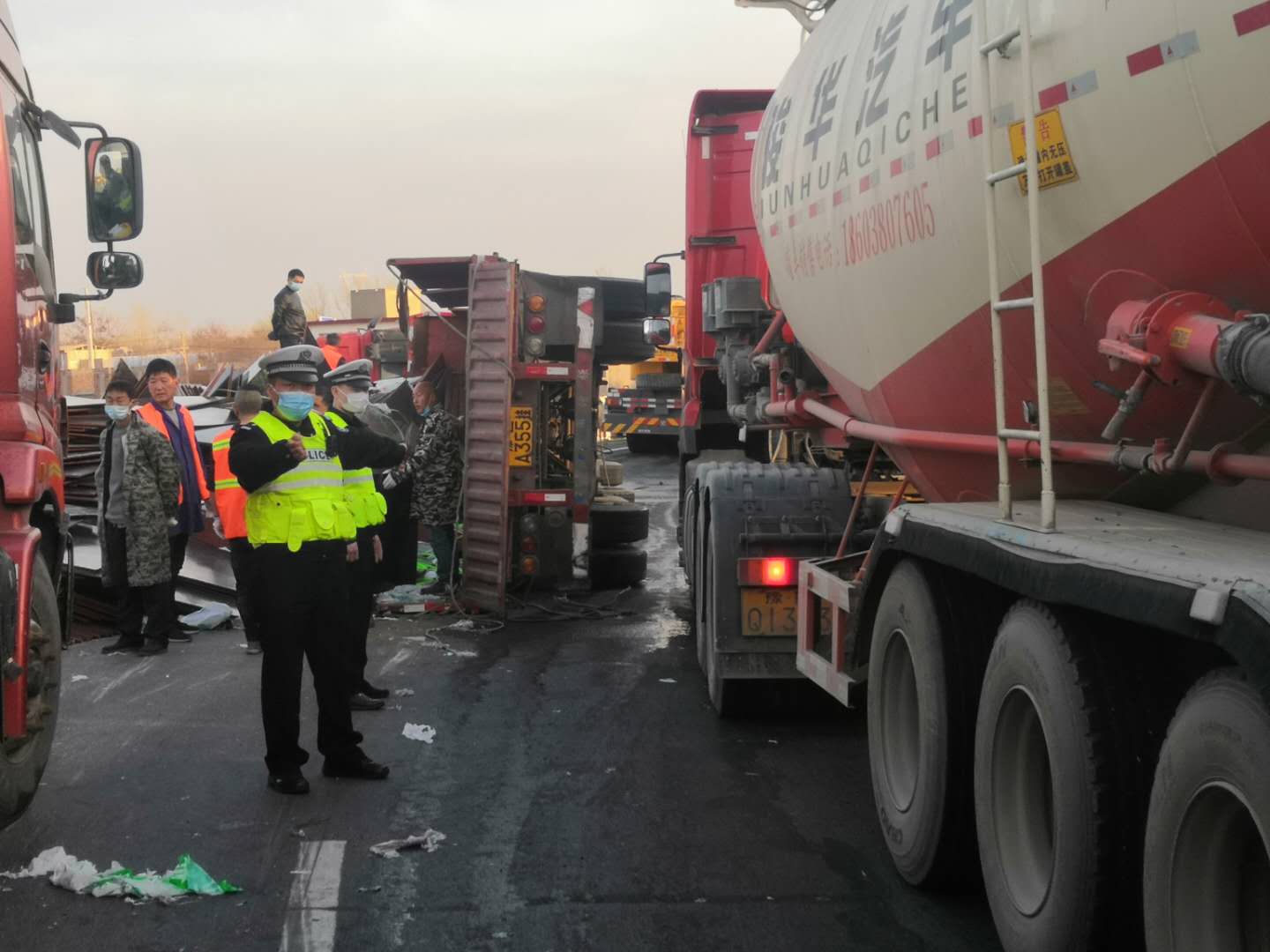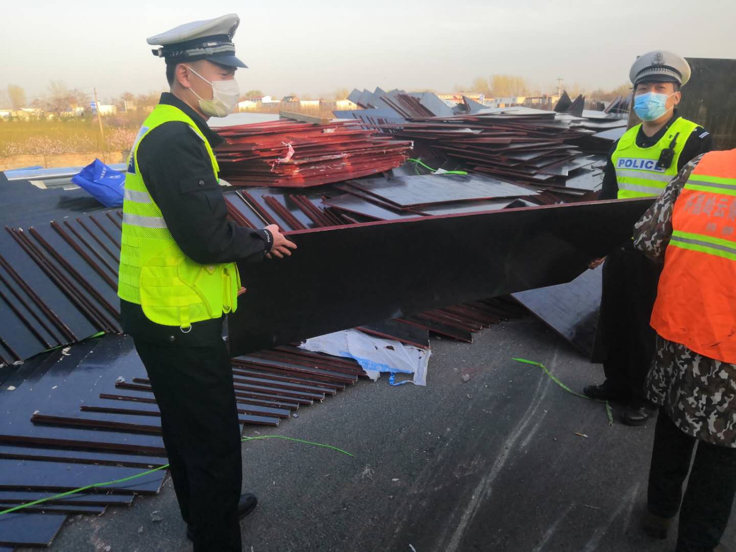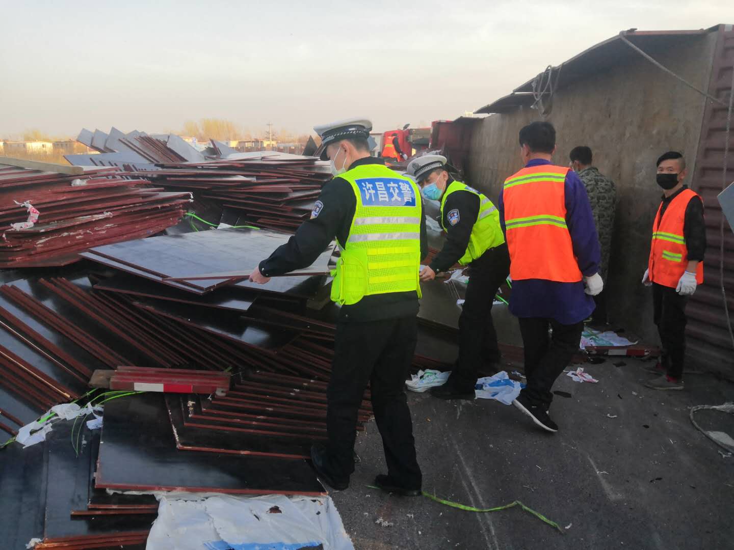 2020年3月18日16时许,许昌市交警支队高速一大队接警,报称京港澳高速许昌东区站匝道处,一辆大货车侧翻,接警后,值班人员立即赶到现场。经现场勘察,司机焦某驾驶豫L半挂牵引车,转弯时因操作不挡,导致车辆侧翻,所载木板全部翻在匝道,所幸车上就司机一人,司机胳膊受轻微伤。因司机到医院检查,不在现场,交警一边疏导交通,一边帮着抬木板,避免造成更大的损失。