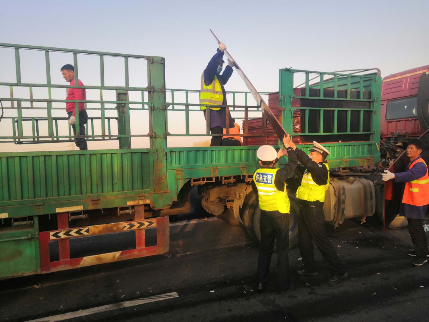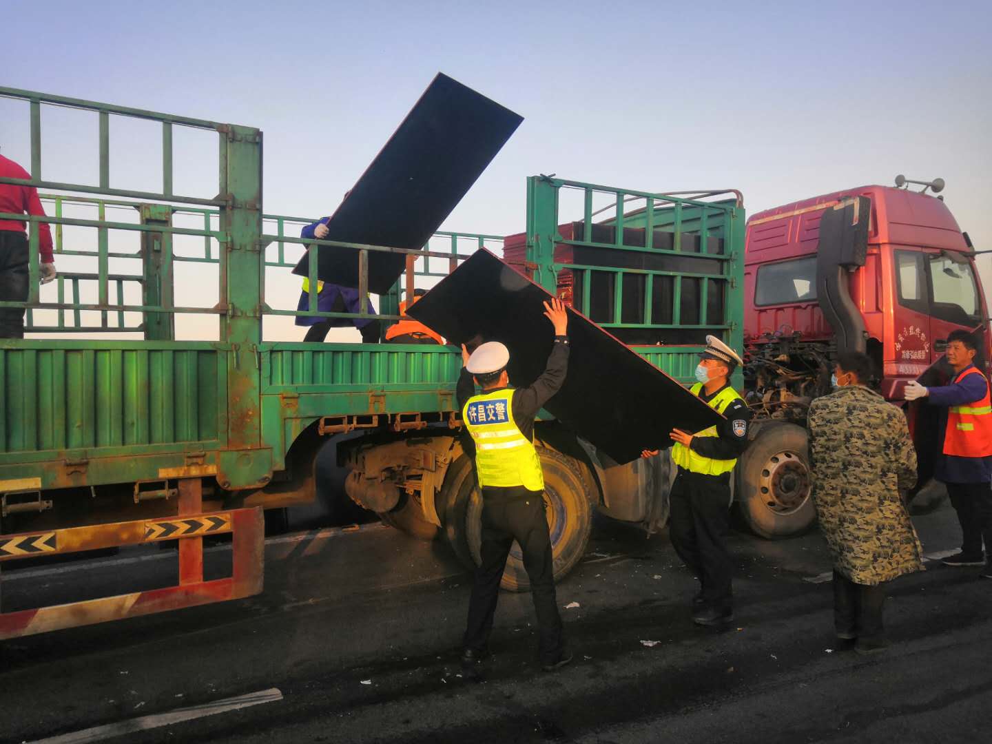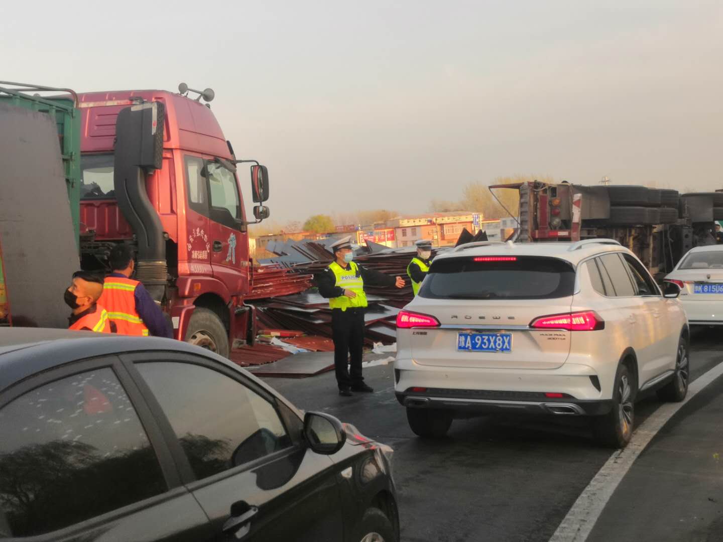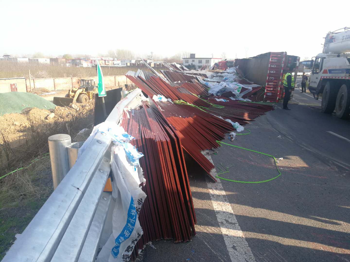 2020年3月18日16时许,许昌市交警支队高速一大队接警,报称京港澳高速许昌东区站匝道处,一辆大货车侧翻,接警后,值班人员立即赶到现场。经现场勘察,司机焦某驾驶豫L半挂牵引车,转弯时因操作不挡,导致车辆侧翻,所载木板全部翻在匝道,所幸车上就司机一人,司机胳膊受轻微伤。因司机到医院检查,不在现场,交警一边疏导交通,一边帮着抬木板,避免造成更大的损失。