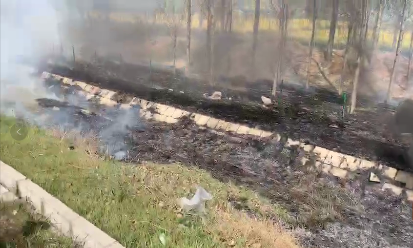 4月4日,开封市高速交警巡逻至连霍高速489公里处时,发现车道外边沟冒着滚滚浓烟,火苗乱窜,有纵深往路边树林里蔓延的趋势,当即拨打了当地的119,请消防人员处置火情。