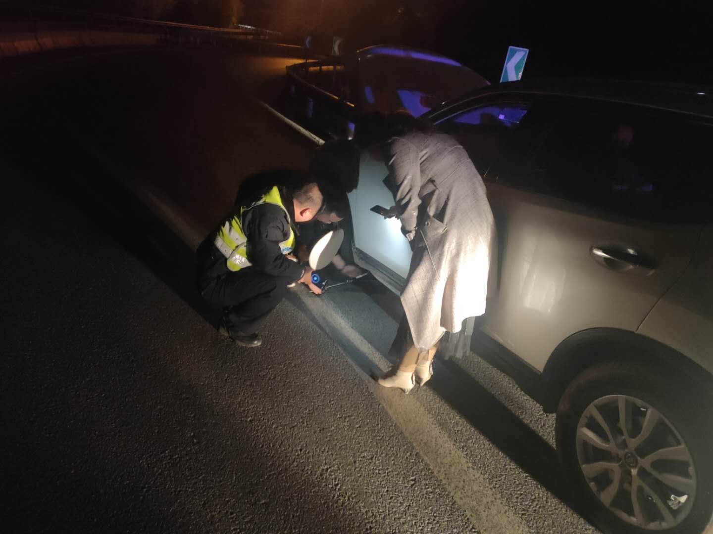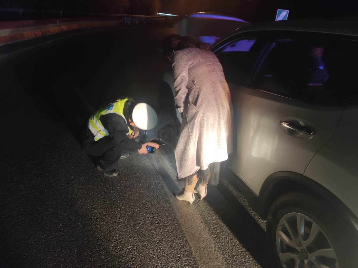 4月6日晚21时,开封高速交警在辖区巡逻至日兰高速兰考北下站口时,发现一辆小型轿车停在应急车道,一名女性驾驶员蹲在车旁。经询问得知,该车辆在行驶途中发生爆胎,第一次遇见这种情况,不知道如何更换备胎。