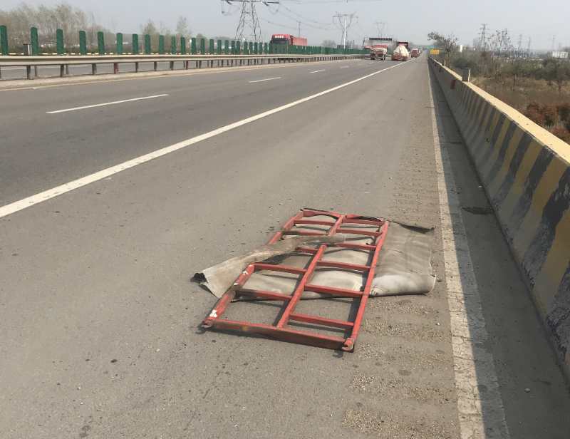 4月7日,平顶山高速交警在巡逻过程中发现有一块货车护栏板掉落路面,占据了大半个行车道,十分危险。高速交警迅速对其进行转移清理,消除了高速道路安全隐患。