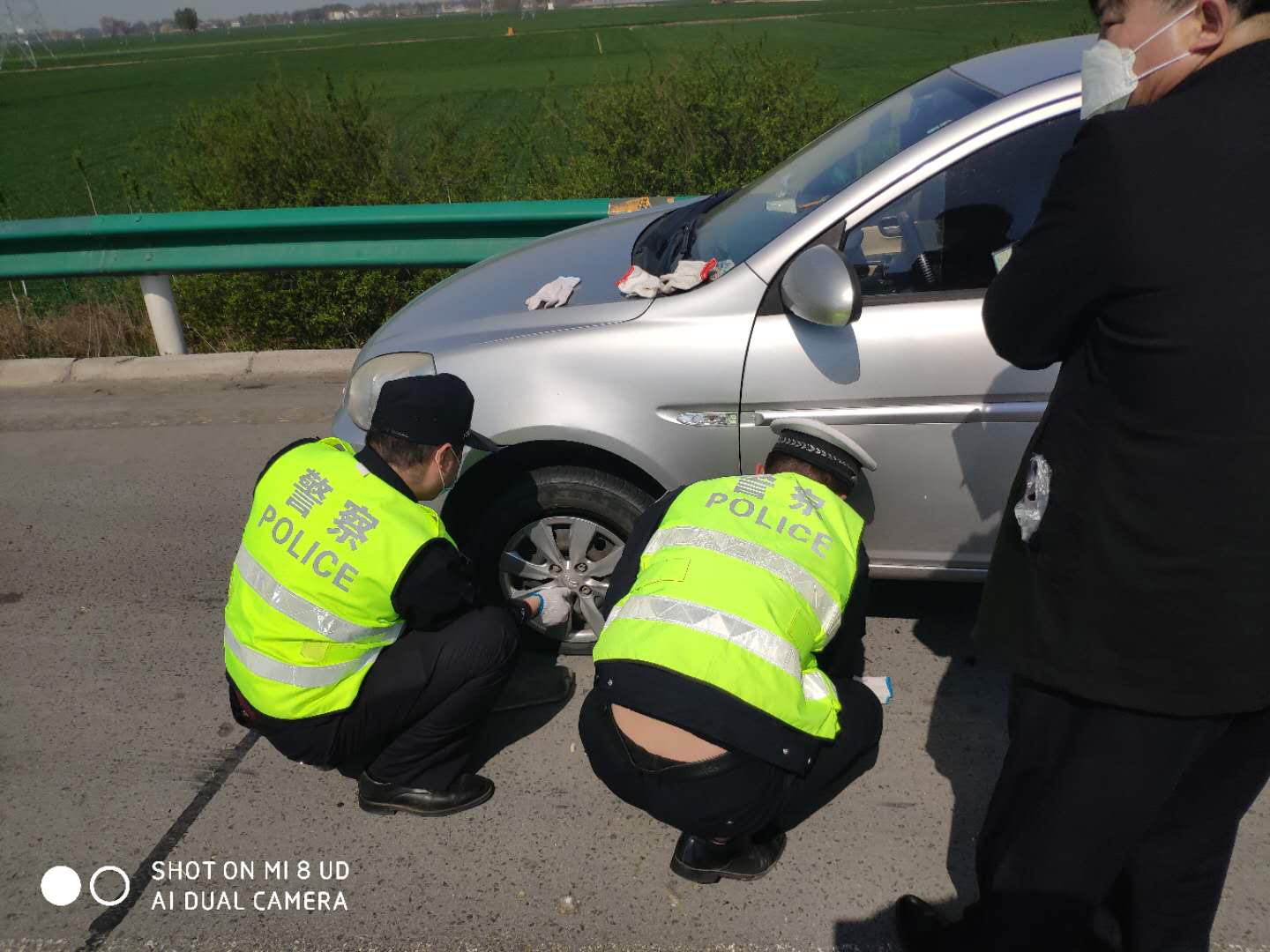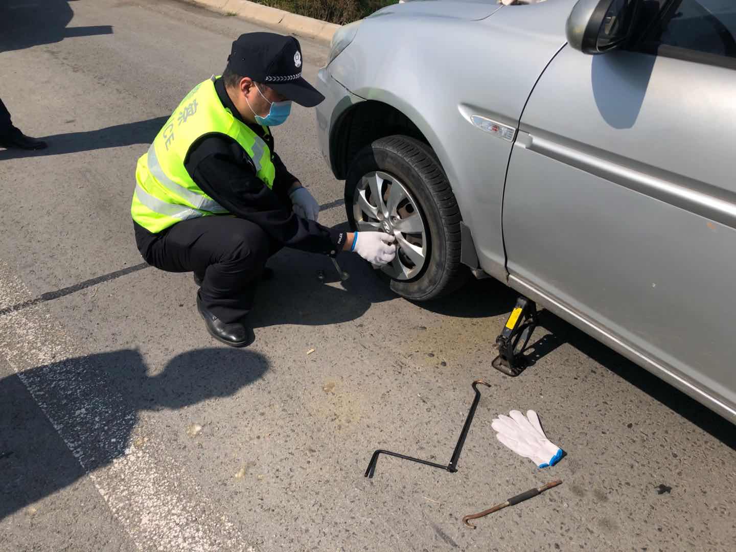 当天上午10时许,安阳市高速交警一大队民警常文校带领辅警处理完事故回大队途中,在大广高速K1853公里处发现一辆小型客车停在应急车道内,民警见此情况立即上前了解情况,驾驶员称车子的左前轮胎没气了,无法行驶,需要换备胎,但是自己不会换,此时大广高速车流量大,车辆呼啸而过,情况十分危险,民警听后立即帮司机换轮胎。经过数分钟,轮胎换好,春风拂面的季节可民警、辅警却已是满头大汗,向驾驶员今后高速行车的注意事项后,民警又继续开展路面巡逻。