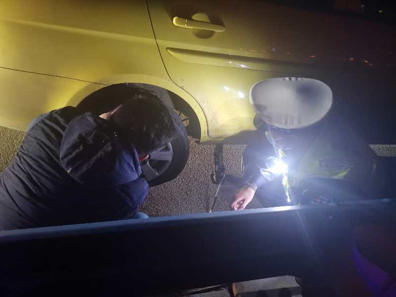 4月11日22时20分许,在京港高速公路500公里处,一辆安阳返邯郸号牌为冀D的小轿车爆胎停在应急车道上,漆黑的夜晚,司机一个人既要照明又要换轮胎,操作极其不便。昨日安阳地区刚下中雪,气温很低,手伸出一会就冻的瑟瑟发抖,修车工具都拿不稳。加上有货车贴身不断高速驶过,非常危险。
