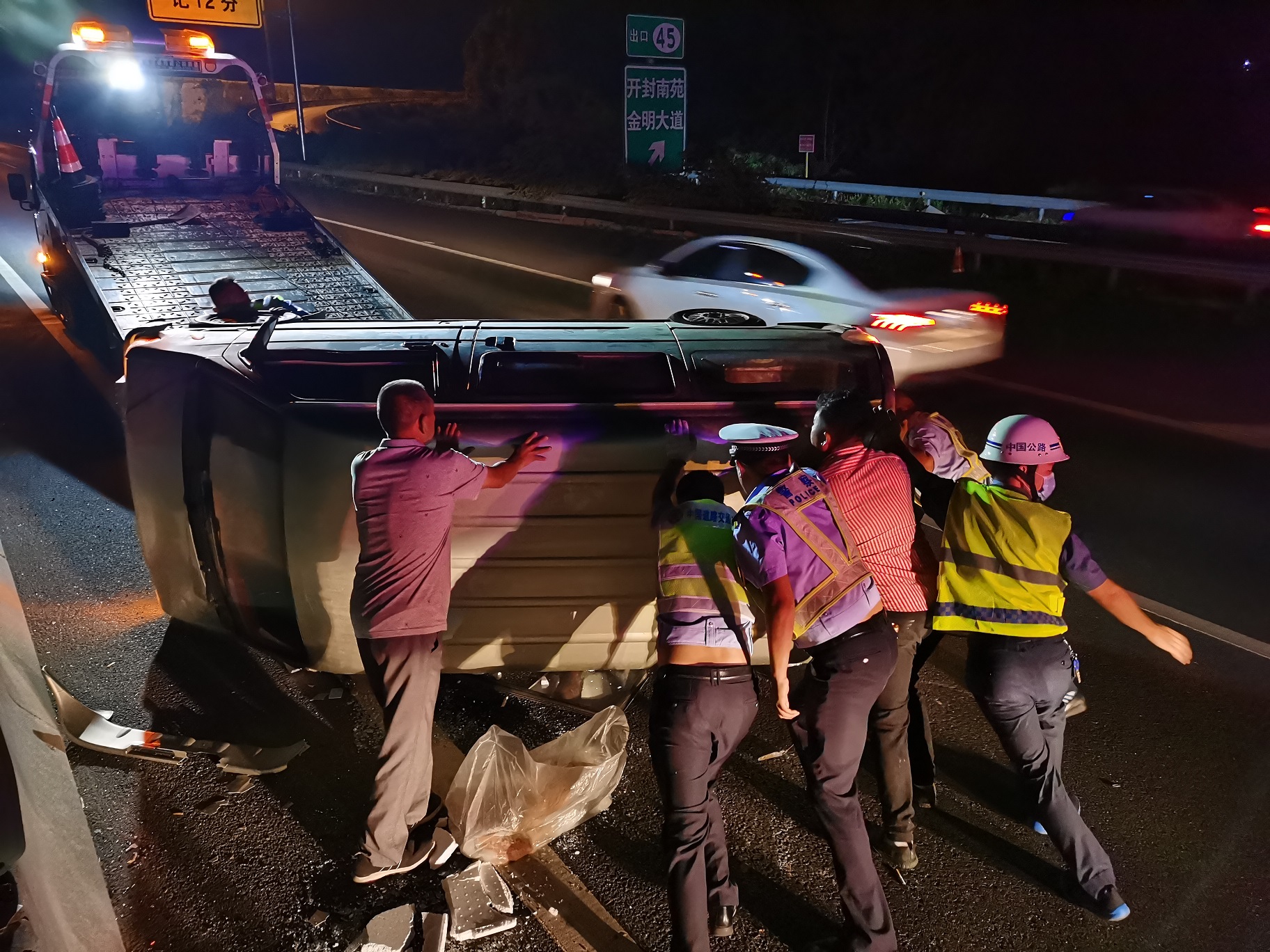 5月28日晚上10点30分许,在郑民高速45KM北半幅,发生了一起单方事故,开封高速交警支队一大队民警接到报警后立即赶赴了事故现场。
