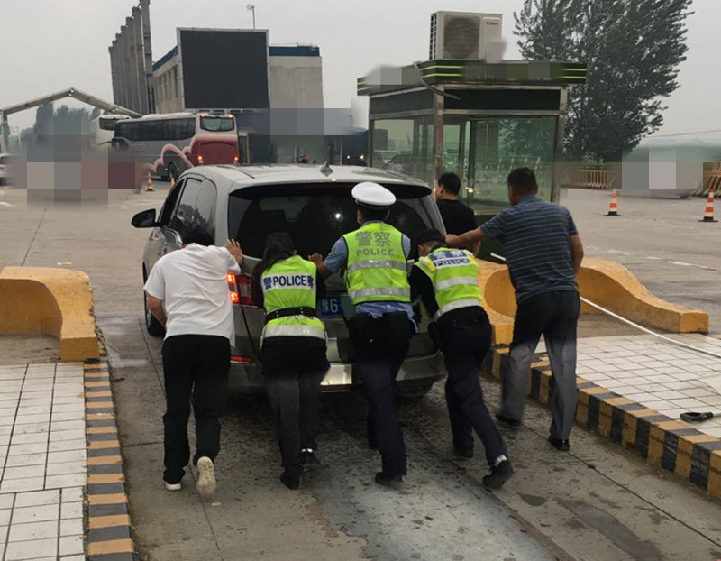 民警接到求助后,迅速赶到现场,到现场后民警发现一辆豫G牌的小型汽车打着双闪灯停在一旁行车道上,上前简单询问情况后就开始帮忙推车。民警让驾驶员控制好车子方向,由民警及车上乘客在后面推车。由于车子是上坡,推起来十分吃力,因为天气炎热,民警的警服也都被汗浸透。经过十多分钟推行,车辆终被推到执勤点的安全停车区内,民警随即帮助联系附近的加油站进行加油补给。